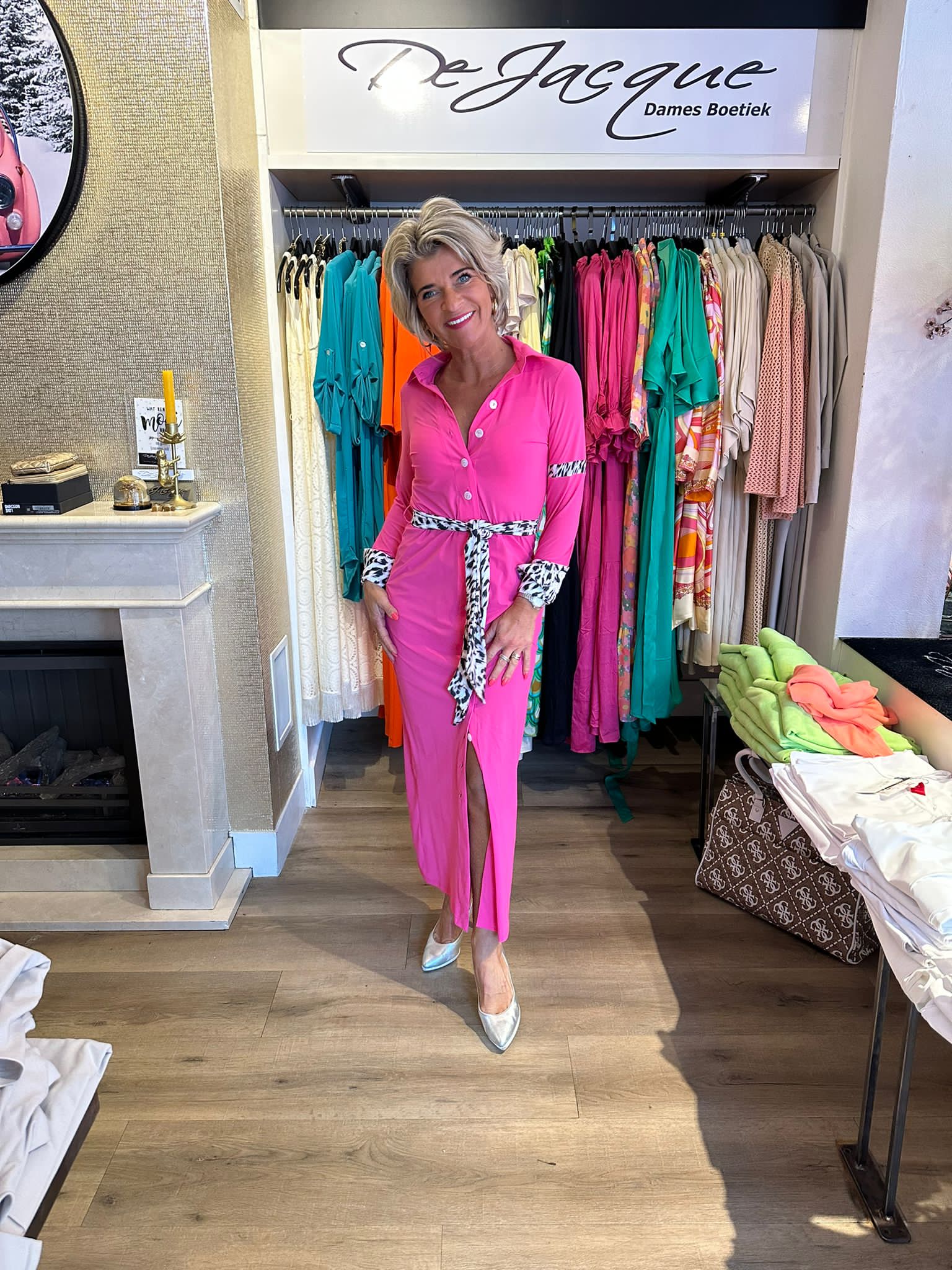 Ontdek de perfecte aanvulling op jouw zomergarderobe met de schitterende DeJacque maxi jurk in een opvallende fuchsia kleur, verrijkt met een subtiele leo print. Deze jurk combineert stijl met comfort, ideaal voor zowel een dag op het strand als een avond uit.