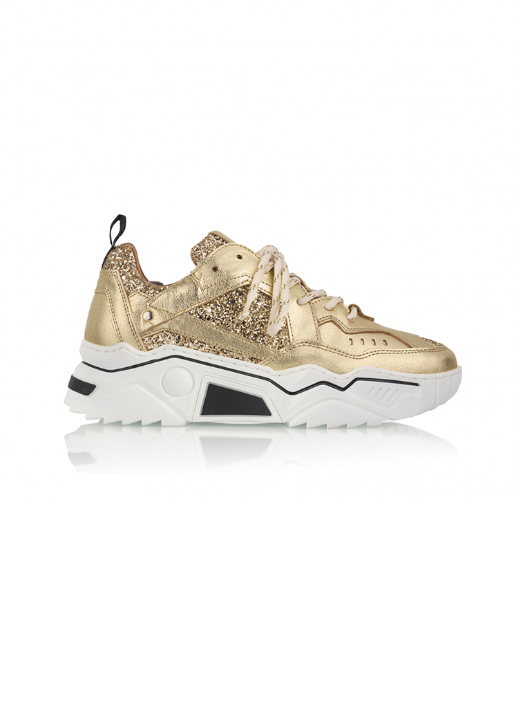 Maxi sneakers zijn dé trend van het moment! Een paar stevige sneakers met een opvallende zool, zoals dit model, mag echt niet ontbreken in de collectie van DWRS Label. Voel je geweldig met deze sprankelende gouden glitter sneakers voor dames, vervaardigd met een buitenkant van leer en een comfortabele lederen binnenkant. Stap in de mode en schitter waar je ook gaat!