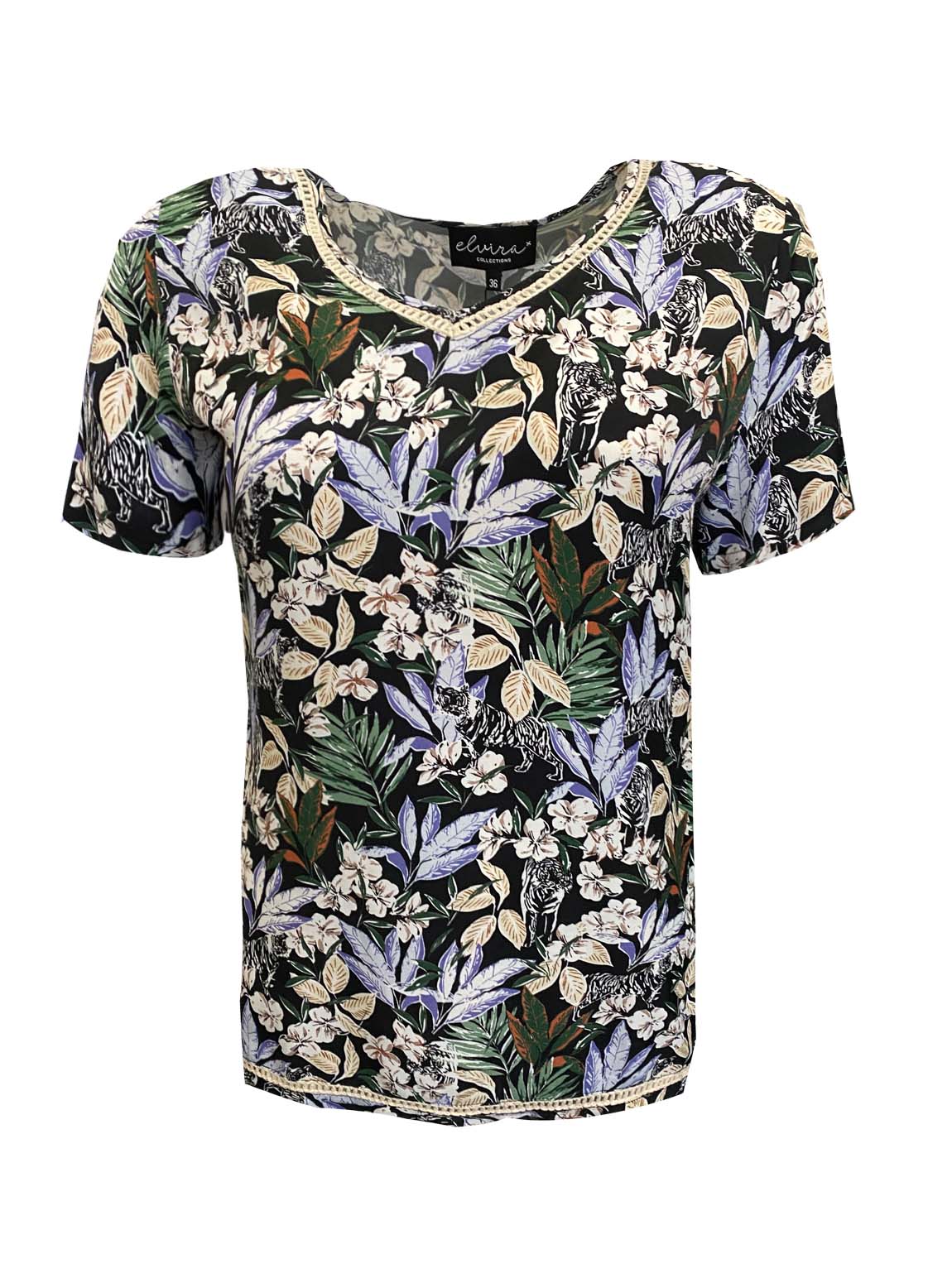 Maak kennis met de stijlvolle Top Nura van ELVIRA CASUALS, een must-have voor elke garderobe deze zomer. Deze zwarte top, met het model van een T-shirt met korte mouw, is perfect voor zowel een casual als een chique look. De unieke kleur 'Jungle Black' voegt een vleugje mysterie toe aan je outfit.
