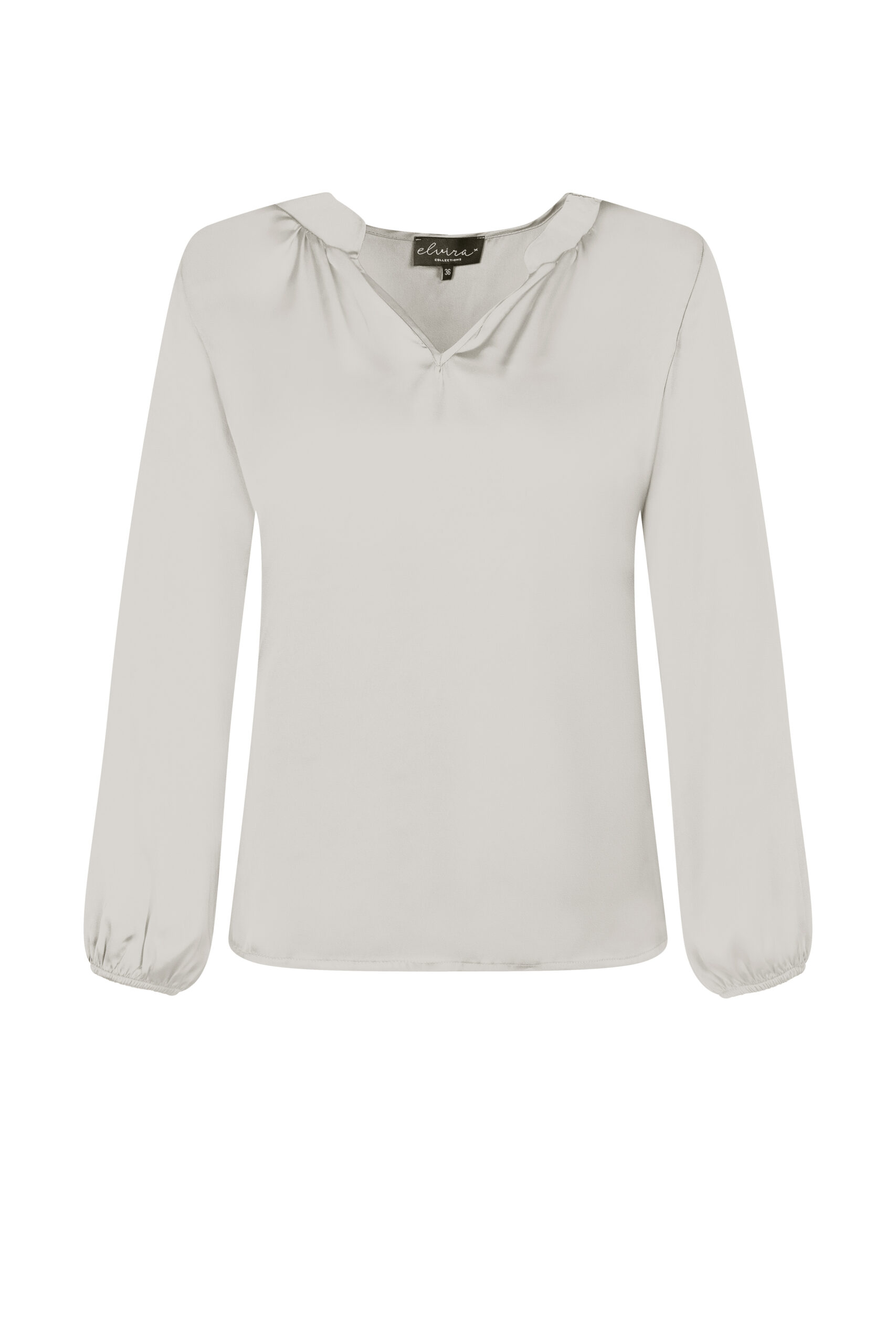 Deze blouse met lange mouw met elastiek in de boord heeft een V-hals met een klein opstaand boordje. De blouse voelt heel zacht aan.