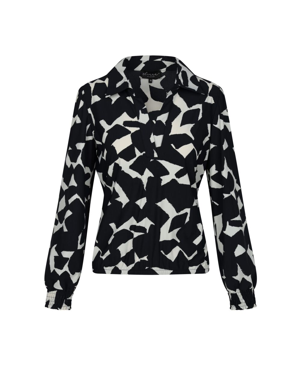 Ontdek de charme van de ELVIRA CASUALS Blouse Carmen in betoverend zwart met een unieke Graphic Travel Print. Deze stijlvolle damesblouse is een perfecte aanvulling op je wintergarderobe, ontworpen om je zowel comfort als een modieuze uitstraling te bieden.