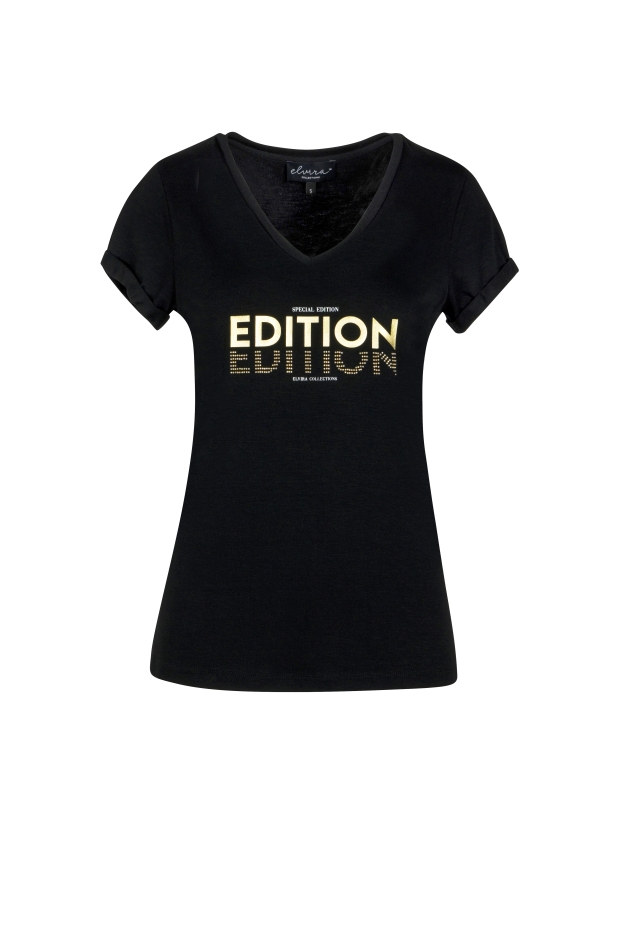 Ontdek de perfecte combinatie van stijl en comfort met het ELVIRA CASUALS E5 23-021 T-Shirt Edition in schitterend zwart met gouden accenten. Dit dames T-shirt, ideaal voor de wintermaanden, biedt een trendy look zonder in te boeten op comfort. Met zijn korte mouwen en unieke kleurcombinatie is dit shirt een must-have voor elke modebewuste vrouw.