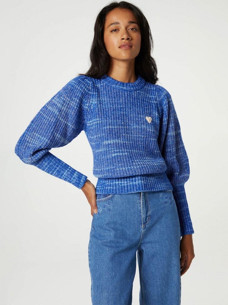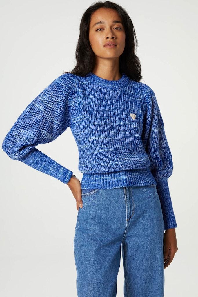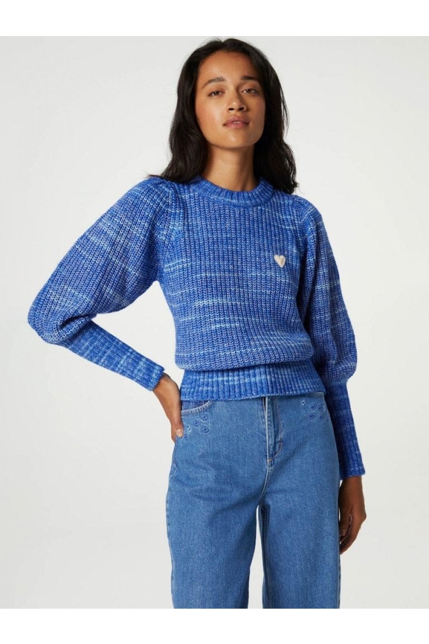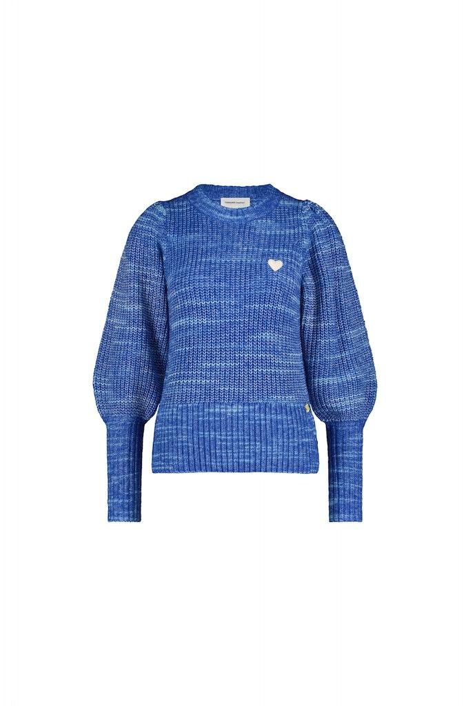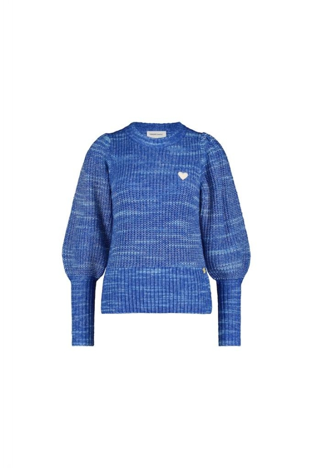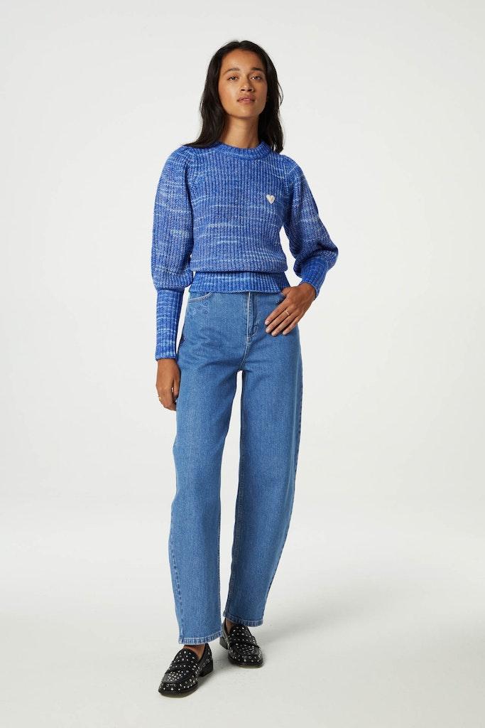 Fijngebreide trui met ronde hals en ballonmouwen met lange manchetten. De Laure Pullover heeft een embroidered hartje op de borst.
