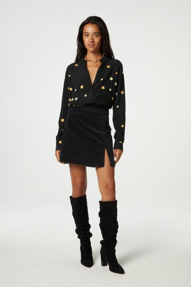 Korte A-lijn corduroy rok met een rits sluiting aan de achterzijde. Vivian Skirt heeft een split aan de linker voorzijde en een klein goud detail.