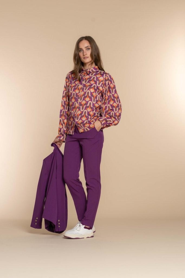 Ervaar retro elegantie met een hedendaagse twist dankzij deze Geisha dames blouse met vintage print. De jaren 70 vibe komt tot leven met de opvallende retro print, terwijl de moderne kleursamenstelling in paars, beige, oranje en khaki een frisse en eigentijdse uitstraling toevoegt. Met zijn klassieke kraag en rechte valling is deze blouse een veelzijdige aanvulling op je garderobe. Draag hem met jeans voor een casual look of met een rok voor een meer formele gelegenheid. Deze Geisha Dames Blouse met Vintage Print biedt de perfecte balans tussen retro charme en eigentijdse stijl.