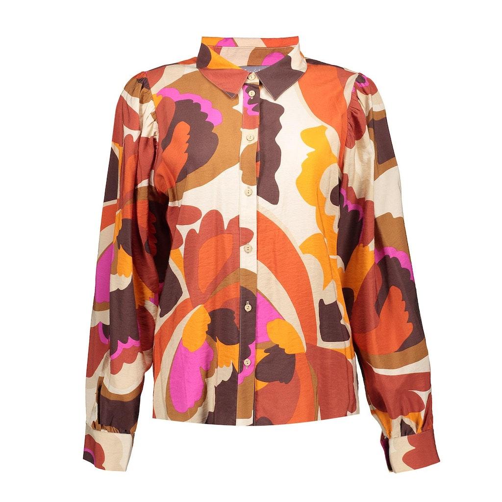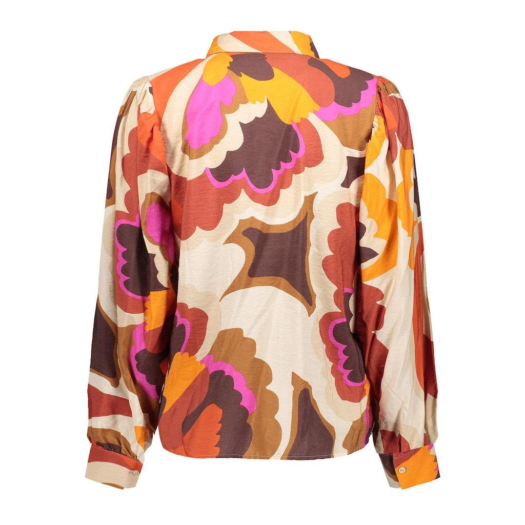 Deze Geisha dames blouse met abstracte print is een verfrissende toevoeging aan je kledingkast. Met zijn klassieke kraag en off-white knoopsluiting straalt deze blouse tijdloze elegantie uit. Wat deze blouse echt speciaal maakt, zijn de pofmouwen met aangesloten manchetten. Ze voegen een vleugje vrouwelijkheid en drama toe aan de anders zo klassieke stijl. De manchetten met knoopsluiting voegen een verfijnde touch toe. De blouse heeft een rechte valling, wat zorgt voor een comfortabele pasvorm en een moeiteloze uitstraling. De abstracte print in warme tinten zoals bruin, fuchsia en oranje op de off-white basis geeft deze blouse een eigentijdse uitstraling. Of je hem nu draagt voor een dag op kantoor, een avondje uit of gewoon als een chique alledaagse look, deze Geisha dames blouse zal je altijd stijlvol en zelfverzekerd laten voelen.