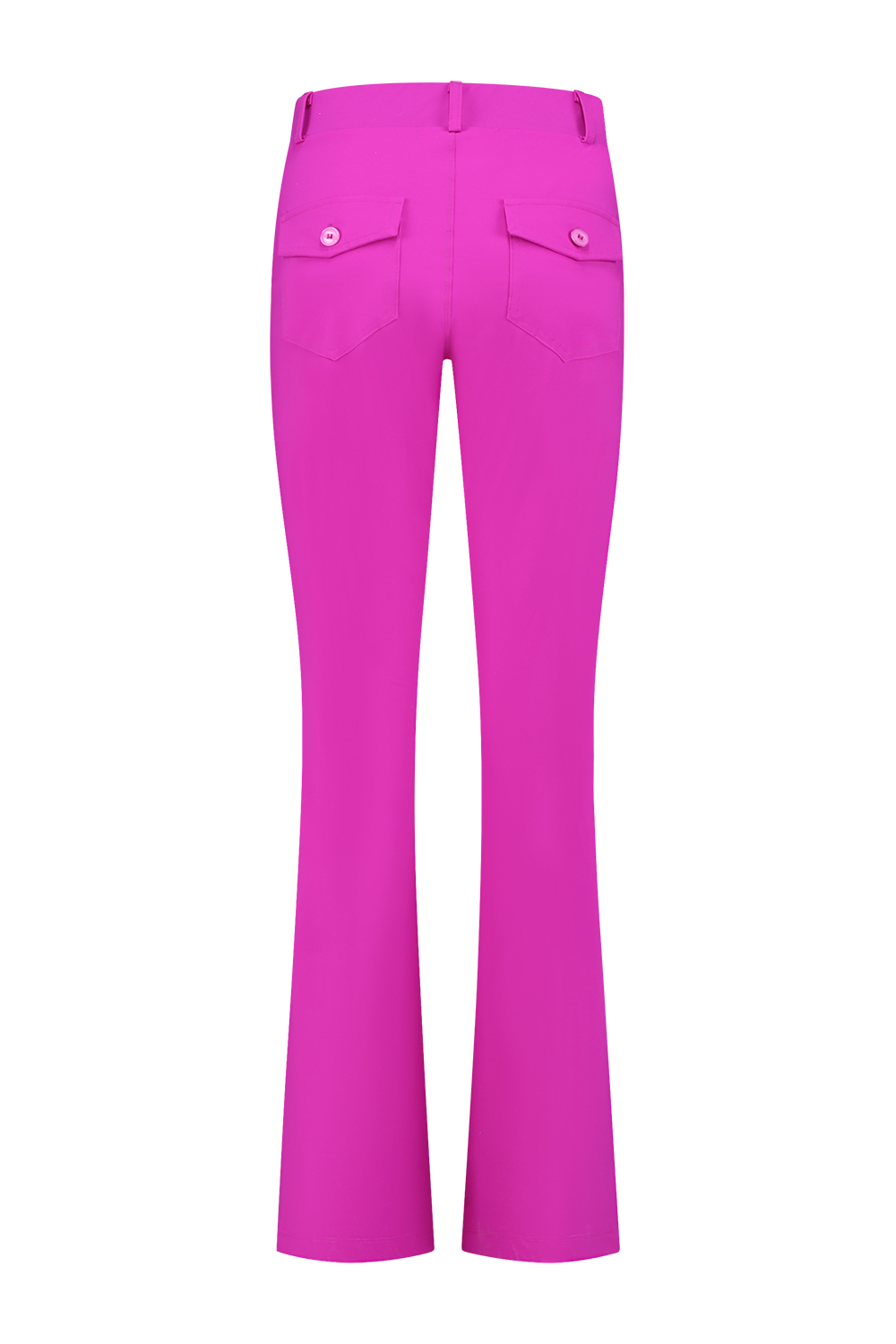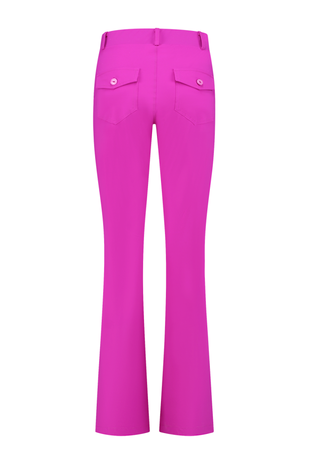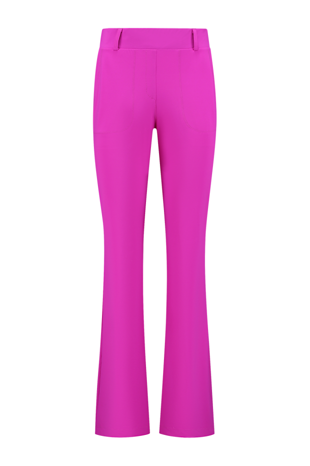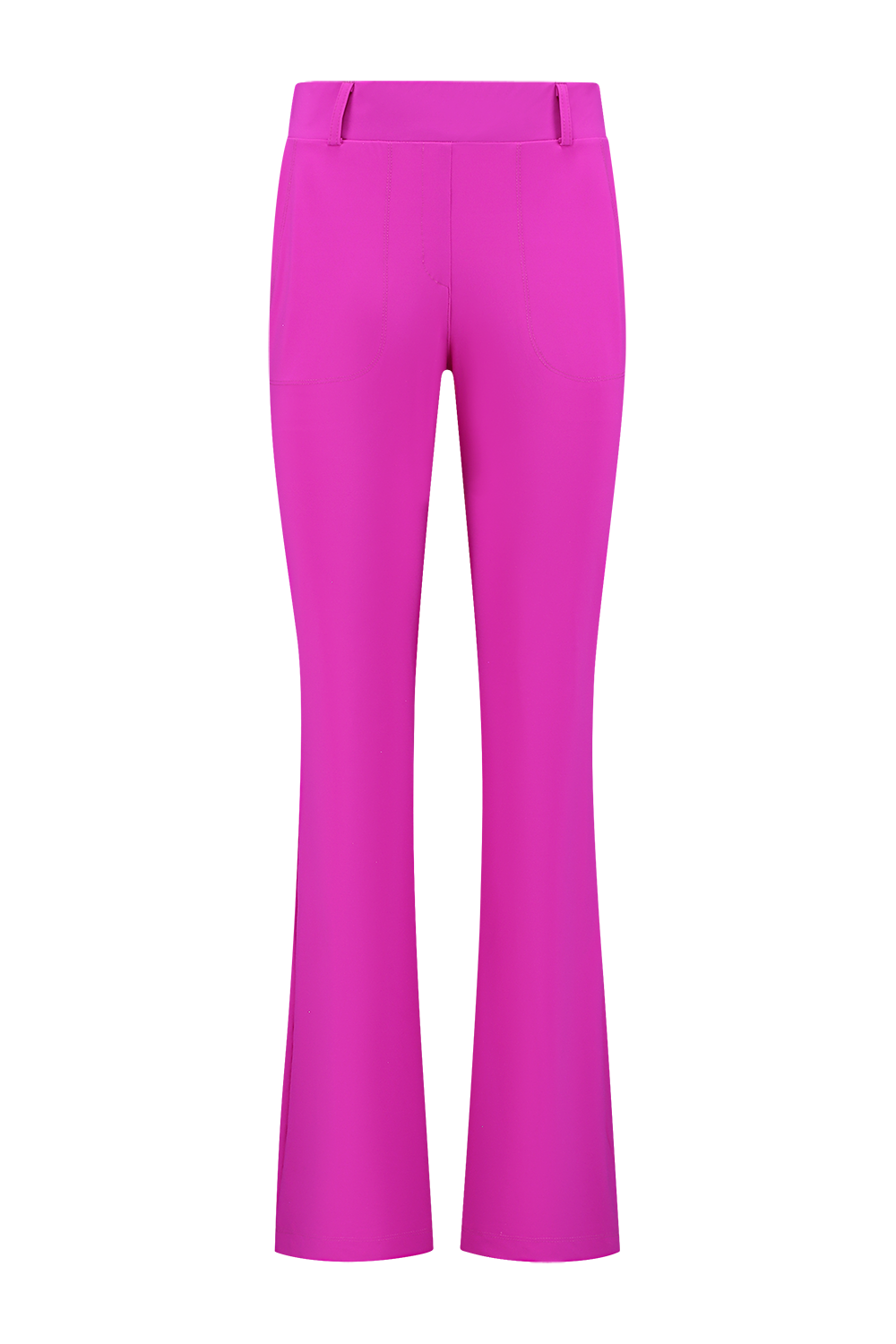 Flair transfer, een vrouwelijk aangesloten model met flair pijp uitgevoerd in de transfer kwaliteit. De broek heeft een elastiekenboord, riemlussen en steekzakken.
