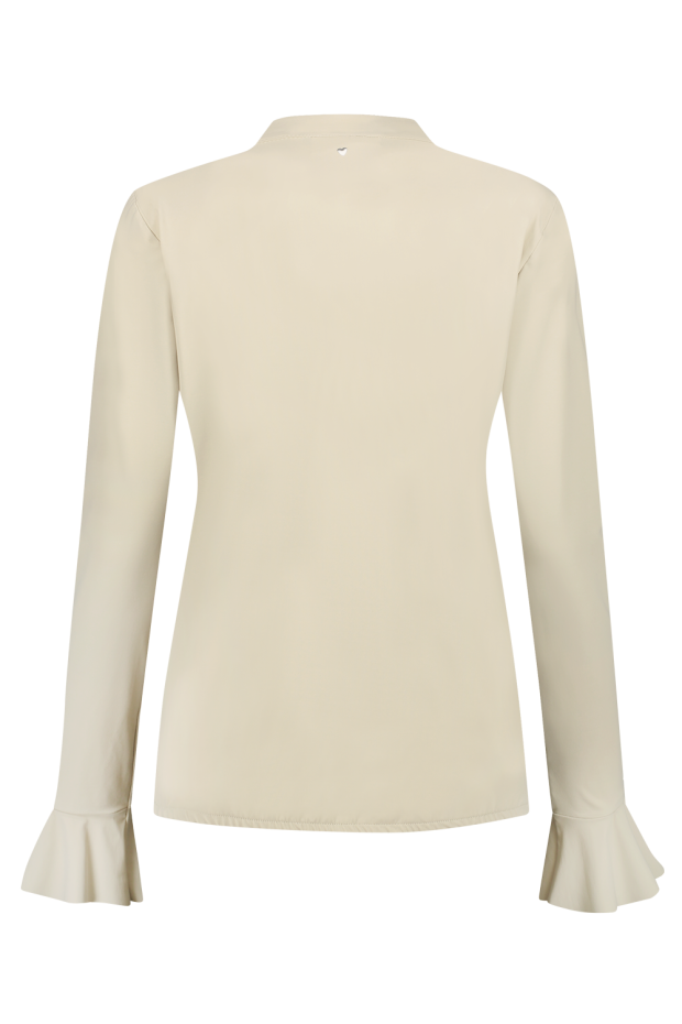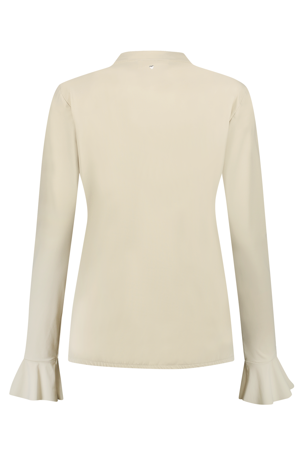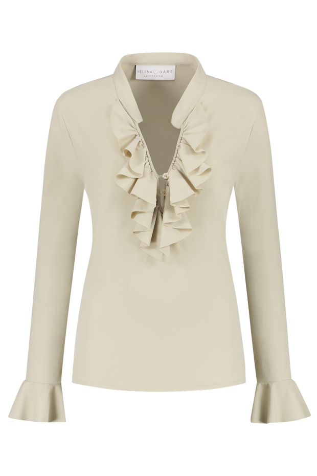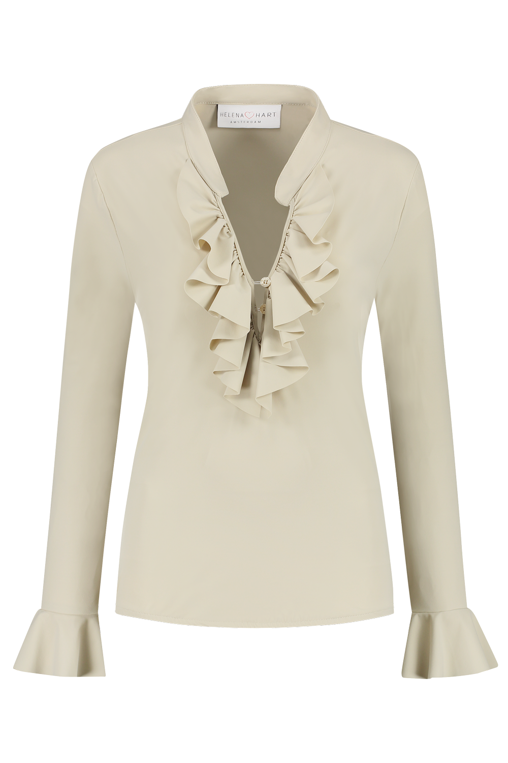 Voeg een vleugje elegantie toe aan je garderobe met de prachtige blouse van HELENA HART. Uitgevoerd in de subtiele kleur kit, is deze blouse met lange mouwen en ruche details de perfecte combinatie van comfort en stijl voor elke gelegenheid.