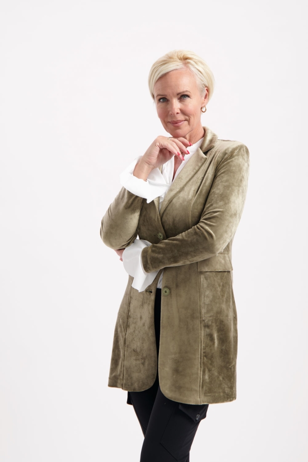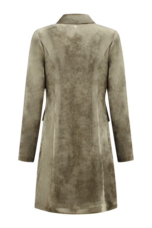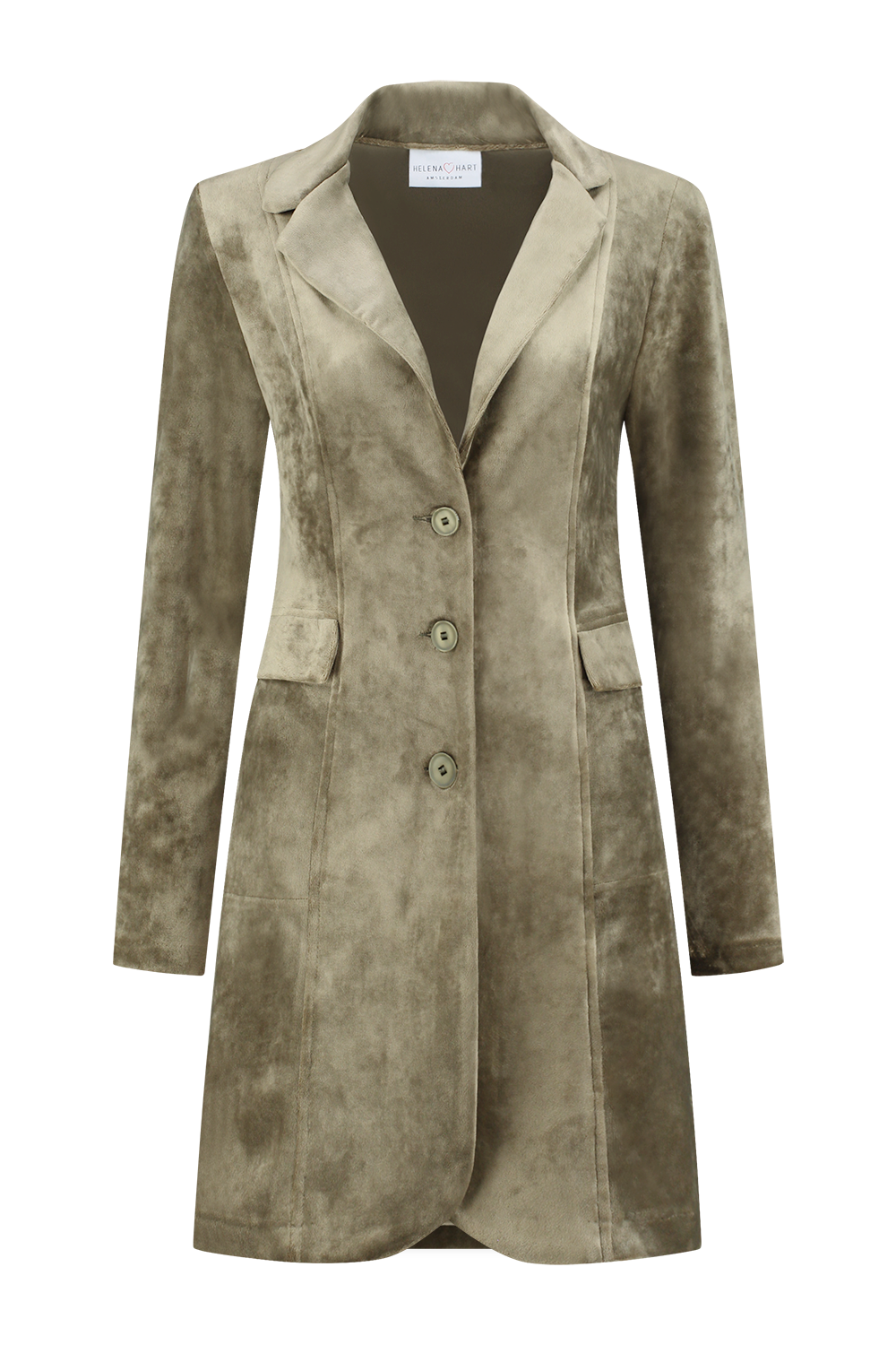 Ontdek de stijlvolle en tijdloze HELENA HART Velours Lang Uni blazer in de prachtige kleur olijf. Deze elegante damesjas is de perfecte toevoeging aan je wintergarderobe, waarmee je zowel overdag als 's avonds een verfijnde uitstraling creëert. Gemaakt voor de modebewuste vrouw die waarde hecht aan kwaliteit en stijl.