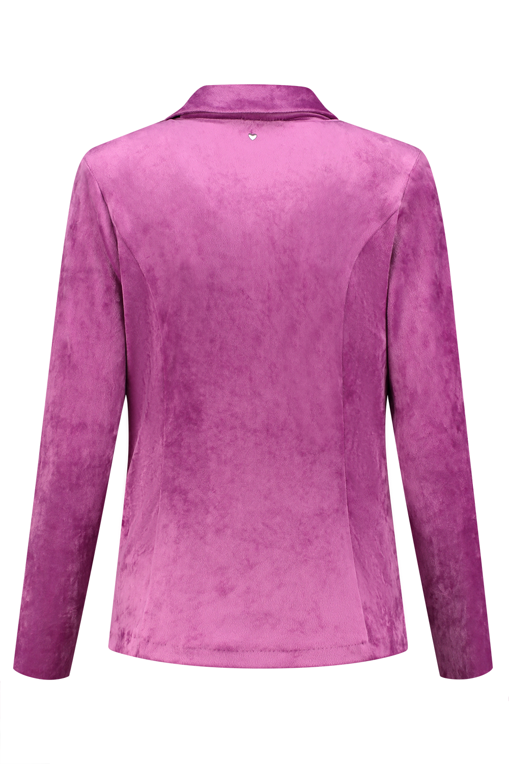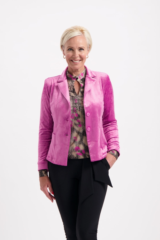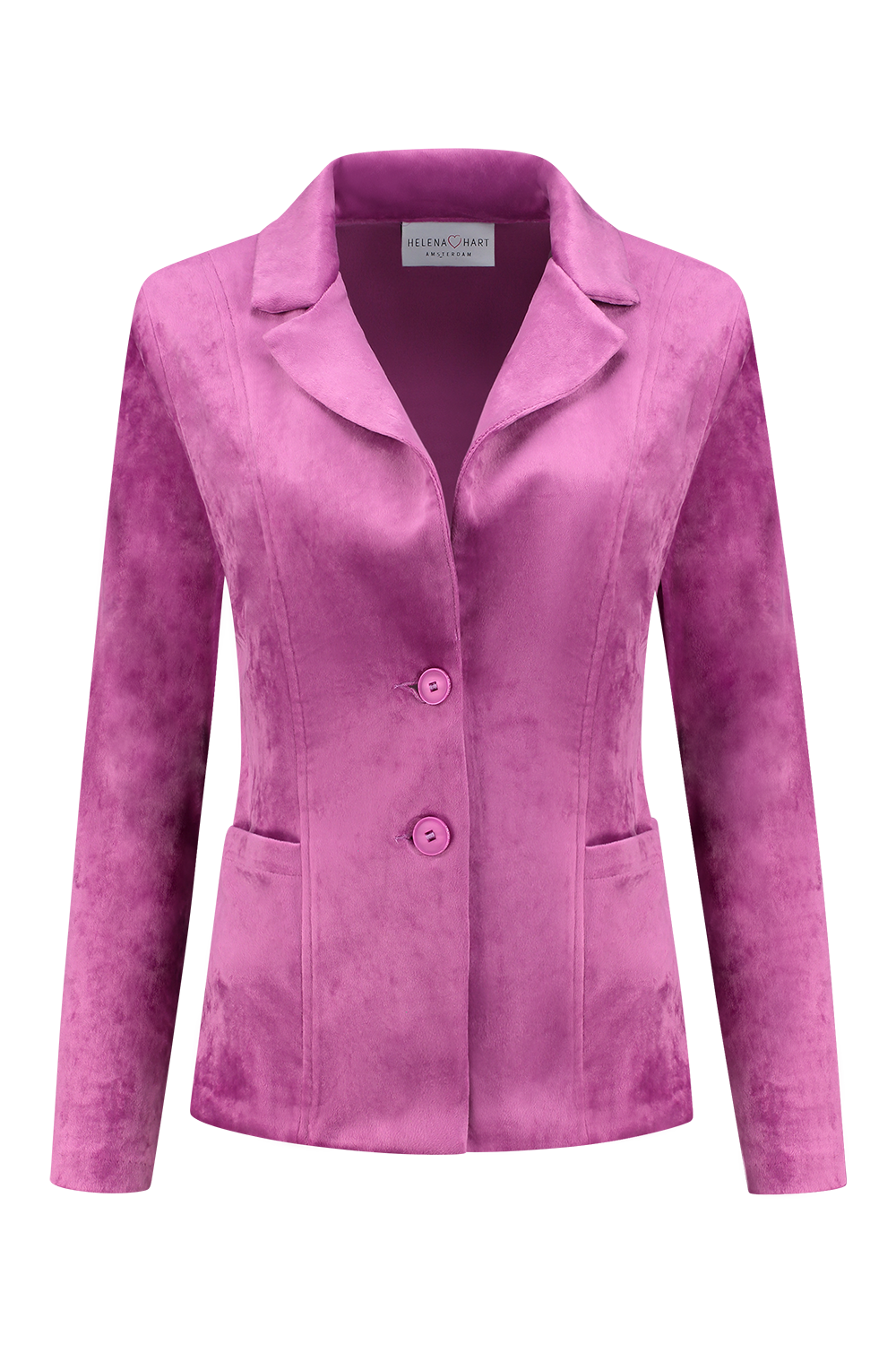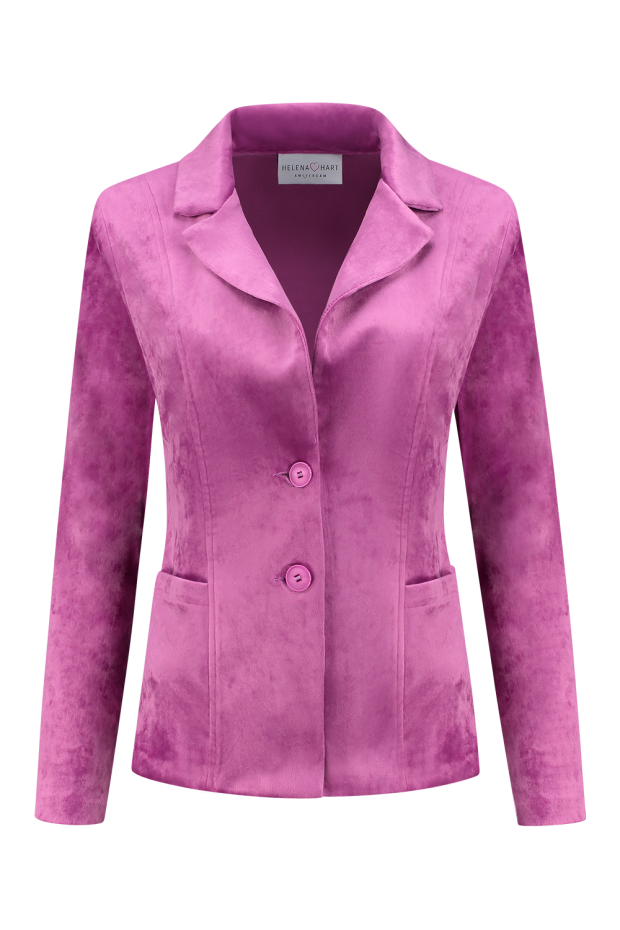 Blazer Velours Kort Uni is een prachtig aangesloten model blazer in de velours kwaliteit. De blazer heeft een aangesloten model en sluit met 2 knopen in kleur met het Helena Hart logo.