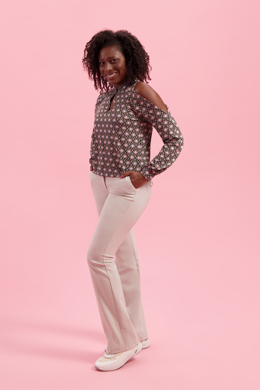 - Flared model zorgt voor een speelse en flatterende pasvorm.
