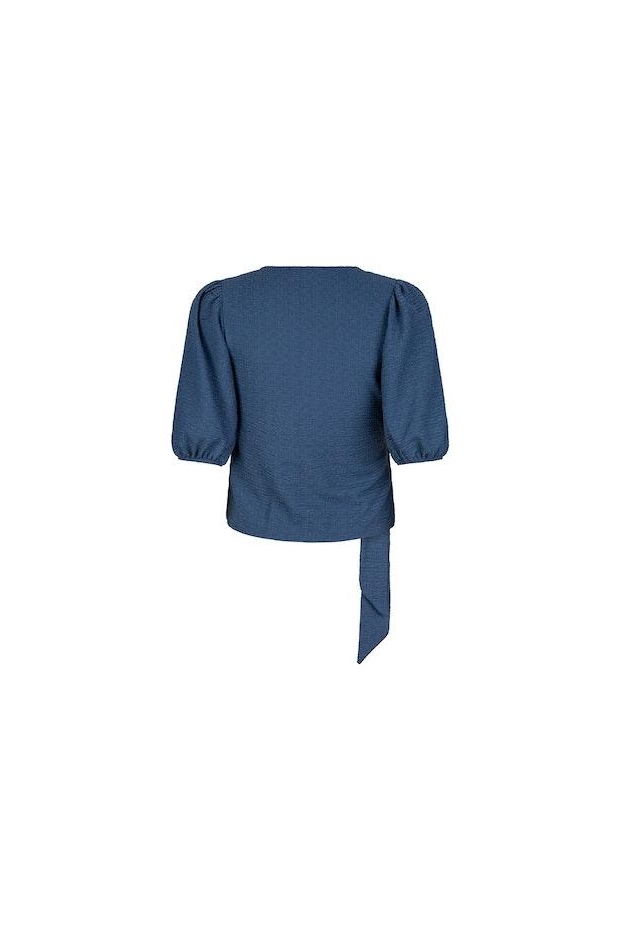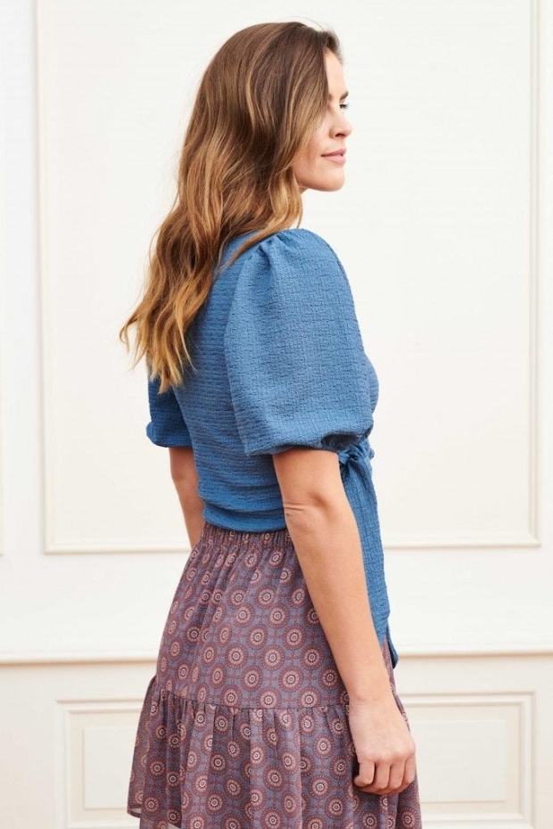 Top Malie is een faux wrap blouse met V-hals en is gemaakt van een stof met een mooi patroon die fijn aanvoelt op de huid. Het strikgedeelte van de roodroze top zit aan de rechterkant. De mouwen vallen tot boven de elleboog en hebben door het elastiek in de mouwuiteinden een subtiel pofeffect.