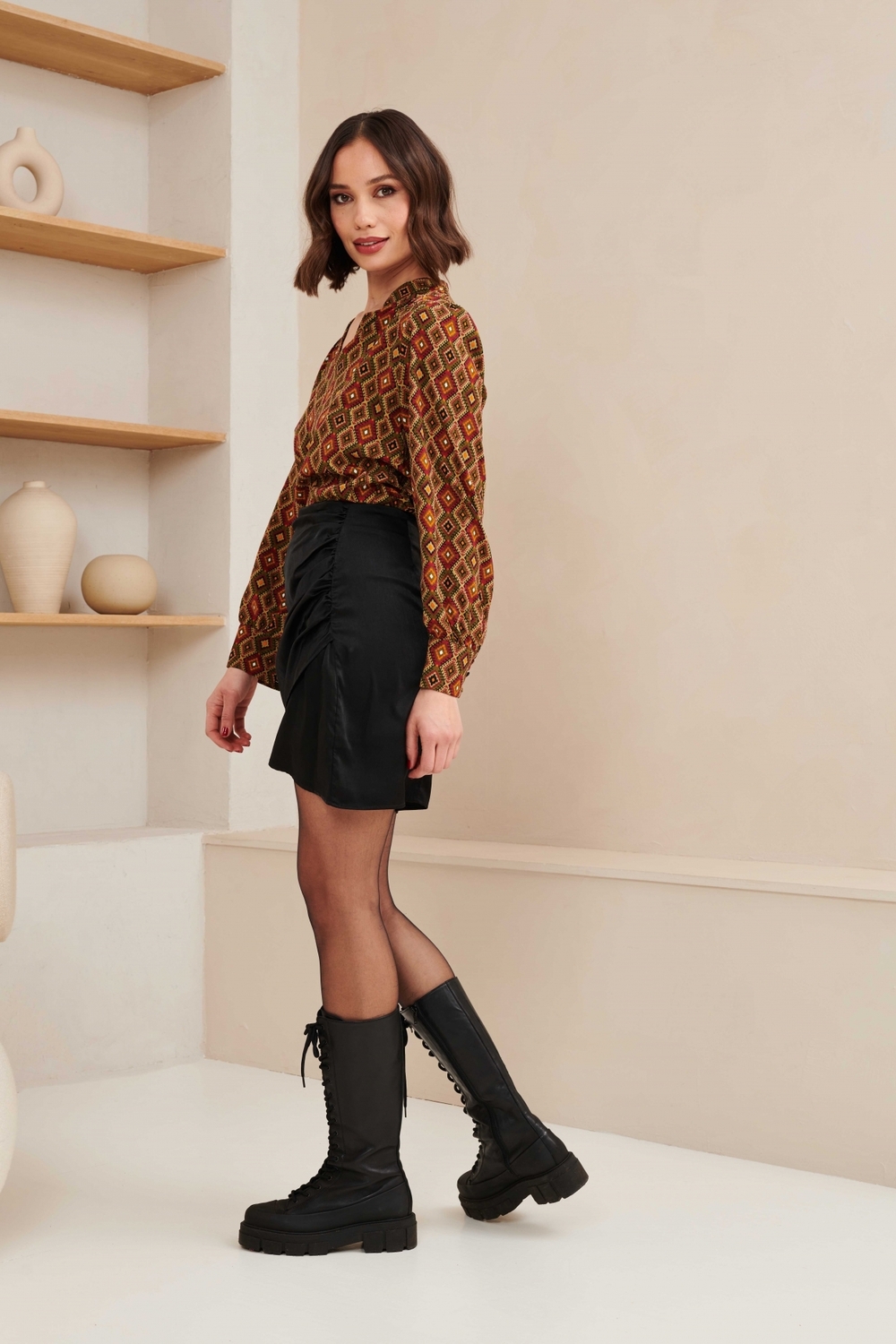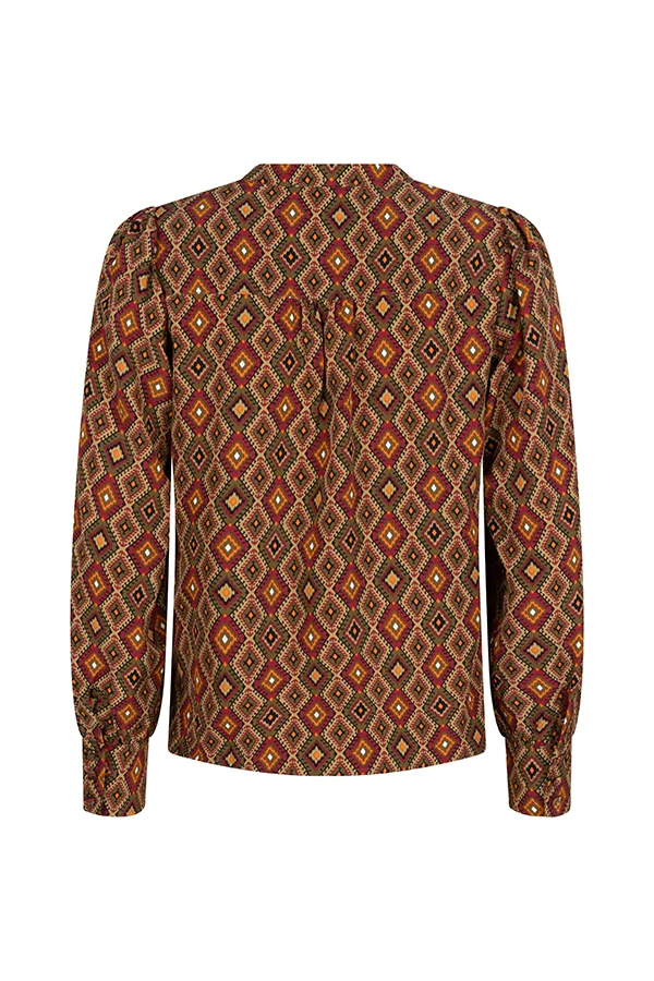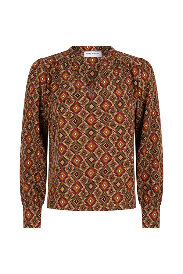 Ontdek de charme van de OK01.1 Blouse Violet van Lofty Manner, een stijlvolle toevoeging aan je garderobe die perfect is voor de wintermaanden. Deze prachtige blouse in een unieke bruine kleur met een groene ikat print brengt een vleugje kleur en originaliteit in je dagelijkse outfits. Speciaal ontworpen voor de modebewuste vrouw die comfort en stijl hoog in het vaandel heeft staan.