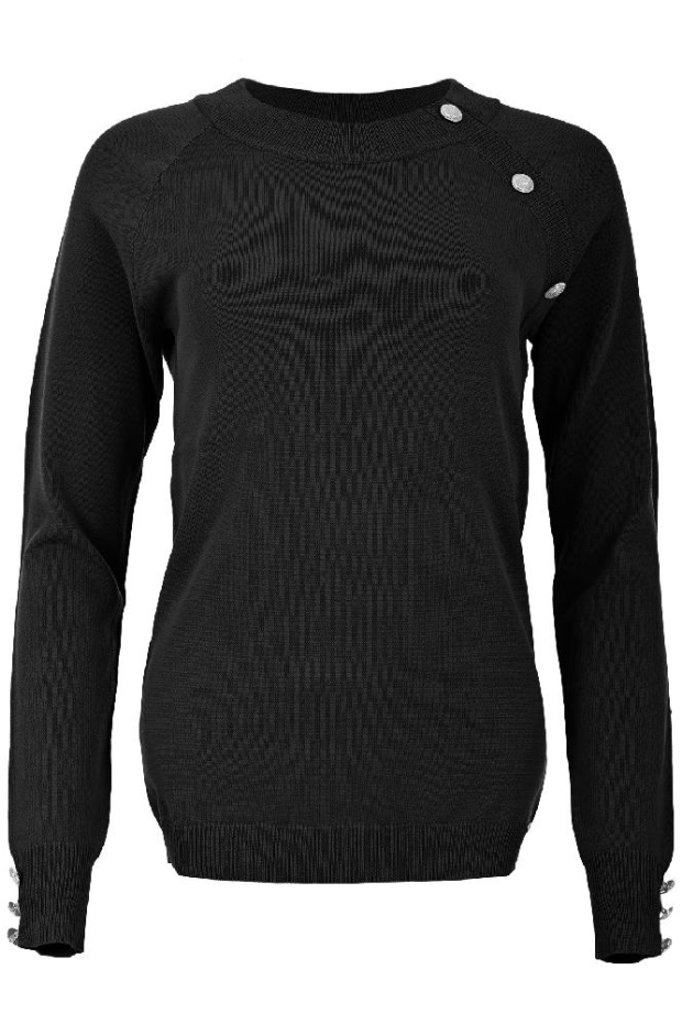 Deze mooie gebreide trui met ronde hals en lange mouwen heeft decoratieve knopen op de schouder en aan de manchetten.