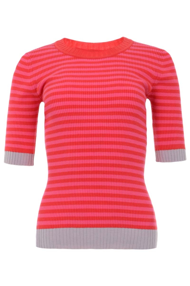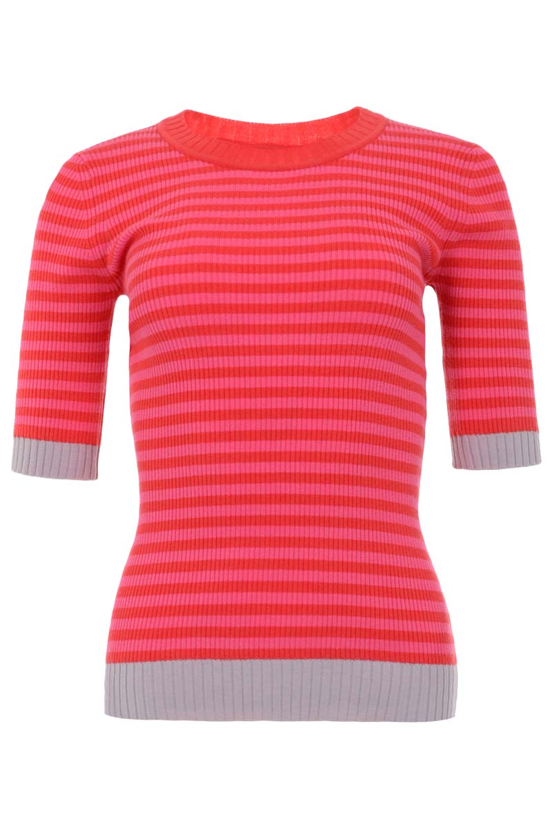 Enitte is een prachtige ribbrei trui in streepjespatroon. Ze heeft een ronde hals met dito kraag en haar (hals)zomen zijn afgewerkt in grovere ribbrei. De trui valt normaal op maat.