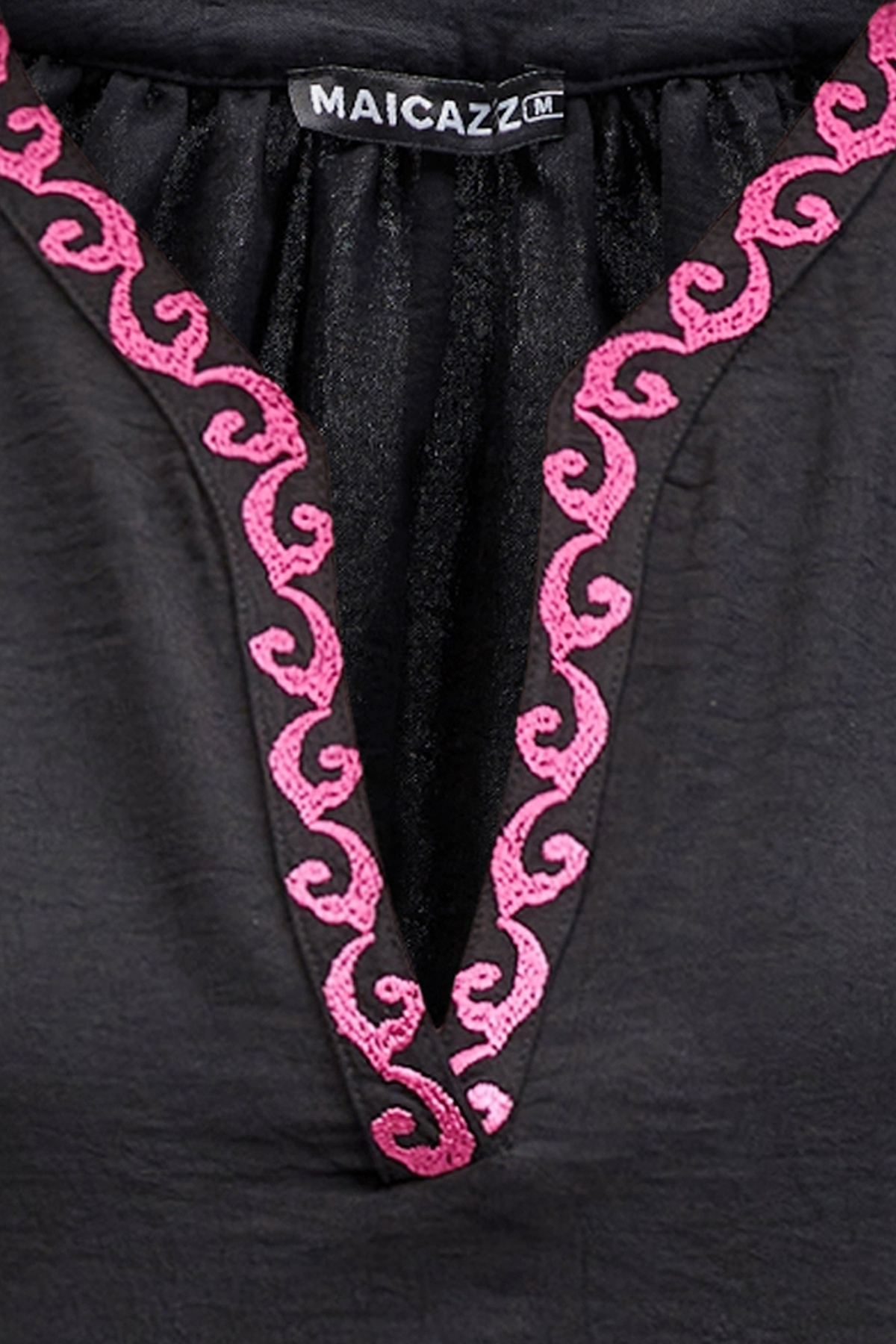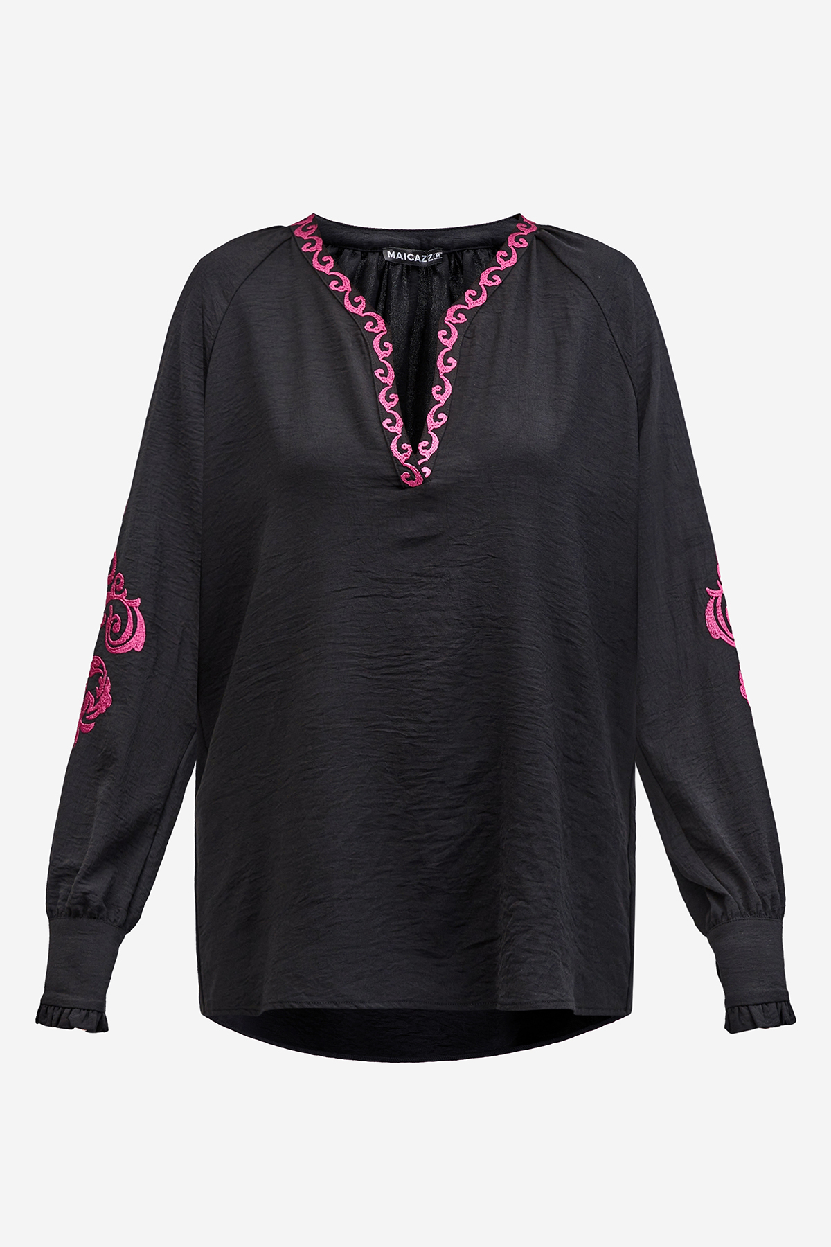 Ontdek de stijlvolle en veelzijdige HALEY-blouse van MAICAZZ, perfect voor elke garderobe deze winter. Met haar elegante zwarte kleur, verrijkt met magenta tinten, biedt deze blouse een unieke combinatie van comfort en mode. Ideaal voor zowel een zakelijke meeting als een avondje uit!