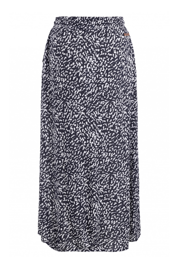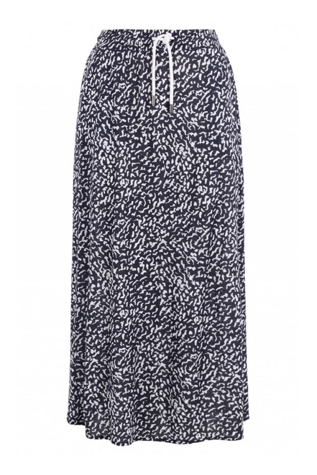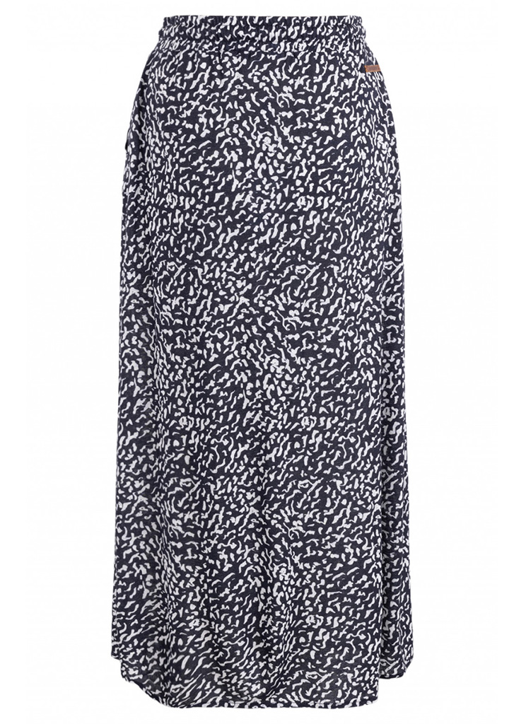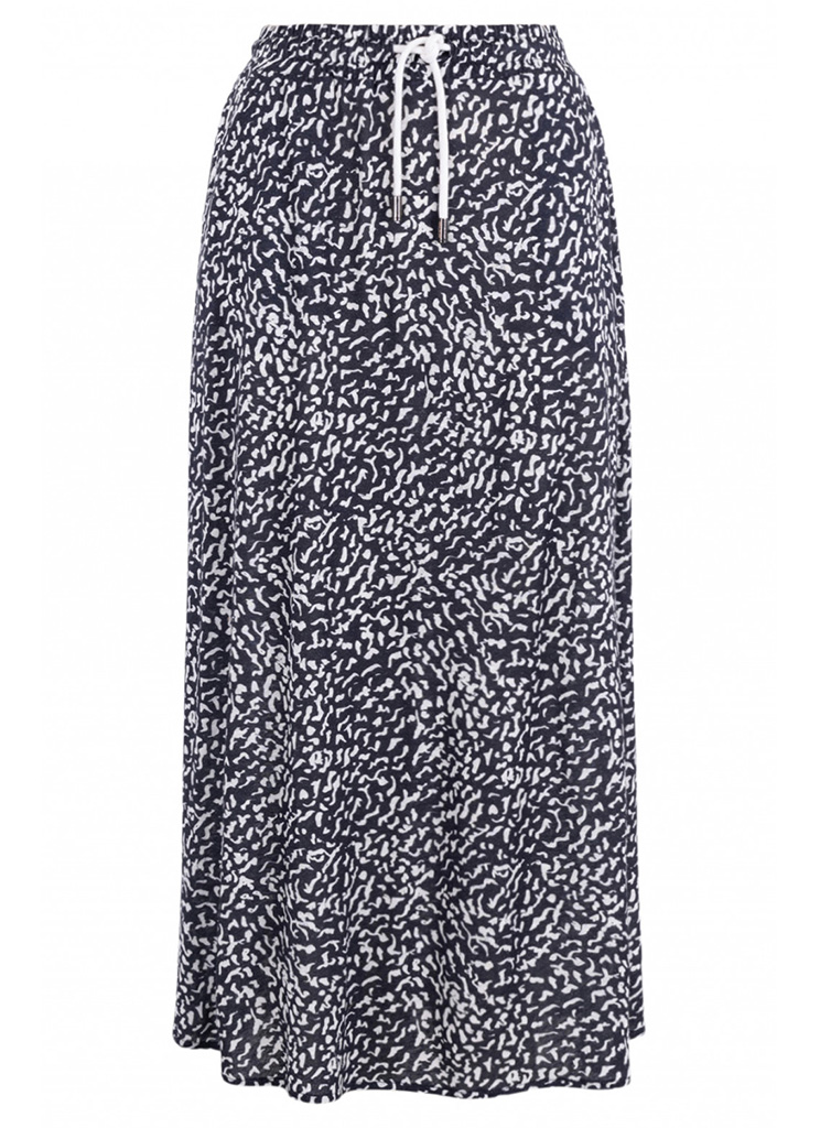 Rok Josie van het merk Moscow in de kleur dark blue met een allover wit dessin. De rok heeft een elastische tailleband met trekkoord en steekzakken op de voorzijde. De rok heeft een rechte pasvorm en is 86 cm lang.