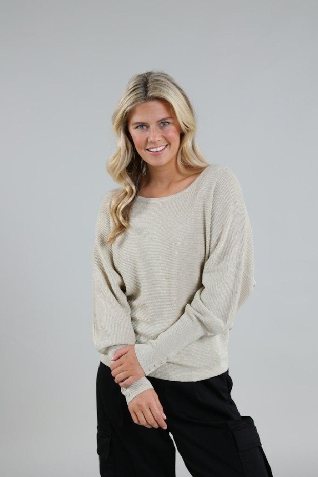 Laat je verrassen door de stijlvolle Batwing Pullover Lurex SS24065 van NUKUS, perfect voor elke dame die waarde hecht aan comfort en stijl. Uitgevoerd in een prachtige zandkleur, is deze trui een veelzijdige toevoeging aan je garderobe die nooit uit de mode raakt.