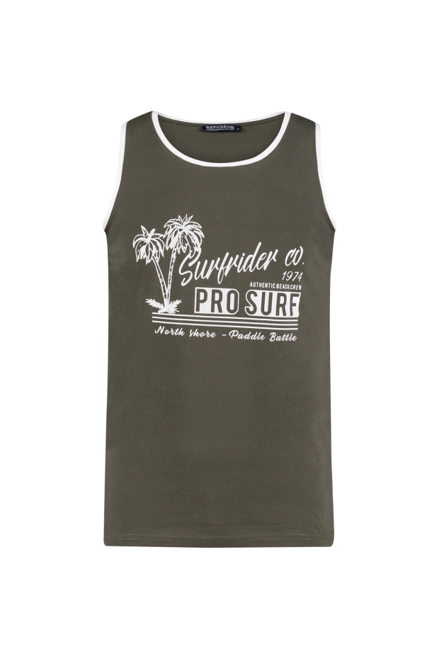 Voeg een vleugje avontuur toe aan je garderobe met de stijlvolle singlet van REFUSION, perfect voor de zomer. Deze top in de kleur army, met een subtiele off white accent, is ontworpen voor de moderne man die waarde hecht aan comfort en stijl. Of je nu naar het strand gaat of een dagje uit in de stad plant, deze singlet houdt je koel en comfortabel.