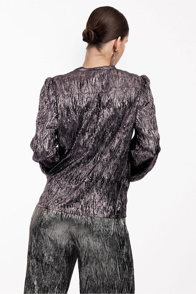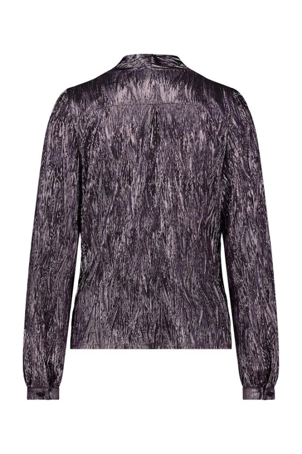 De Joan shiny plisse top van Studio Anneloes is door het overslagmodel en het golvende, dieppaarse materiaal een vrouwelijke en feestelijke top.