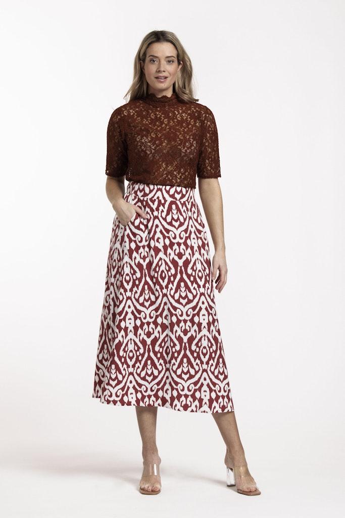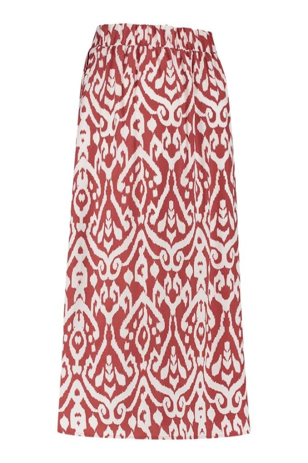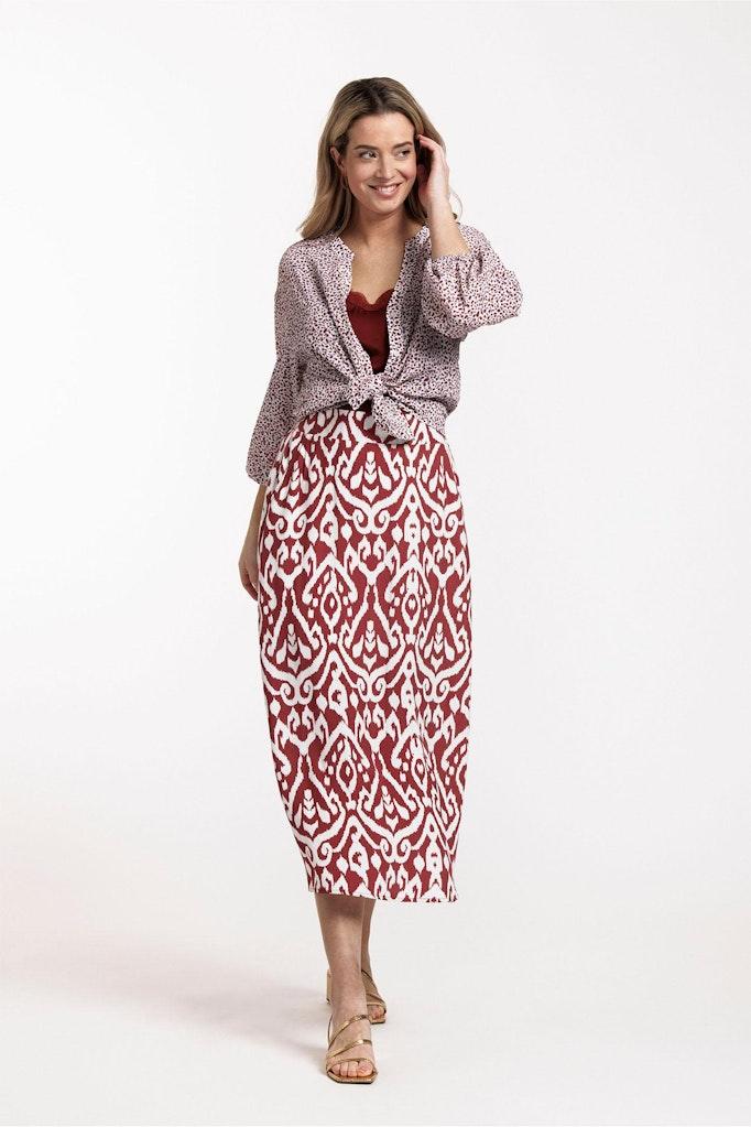 Ontdek de perfecte aanvulling op jouw zomergarderobe met de Yfke ornament skirt van STUDIO ANNELOES. Deze prachtige rok in een warme bruine kleur, versierd met een stijlvol terra/off white ornamentpatroon, is een echte blikvanger en biedt zowel comfort als stijl voor elke gelegenheid.