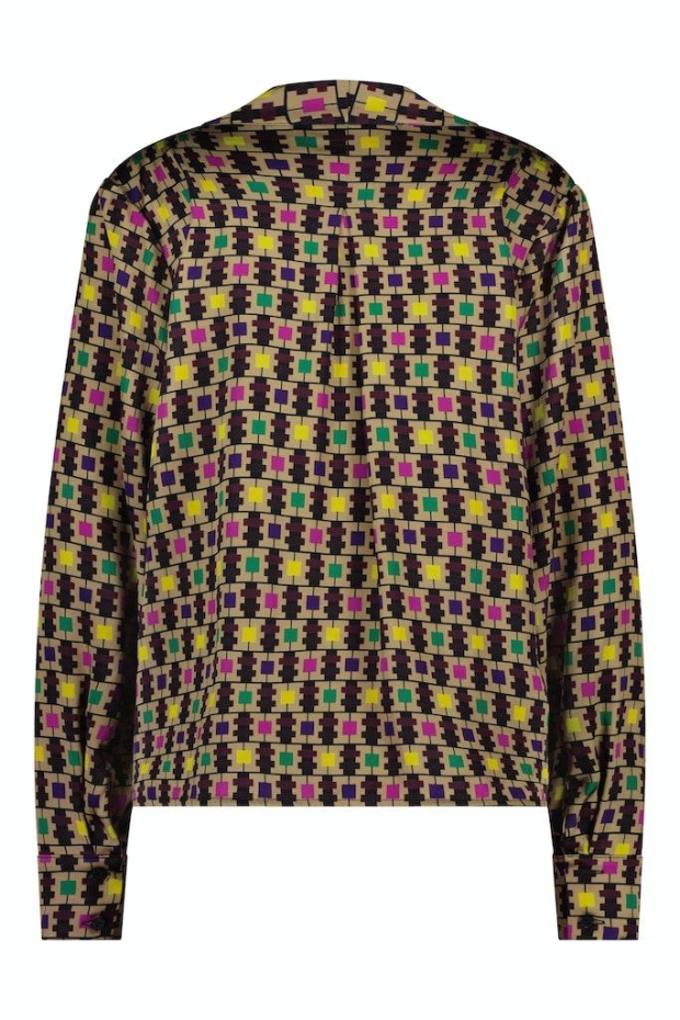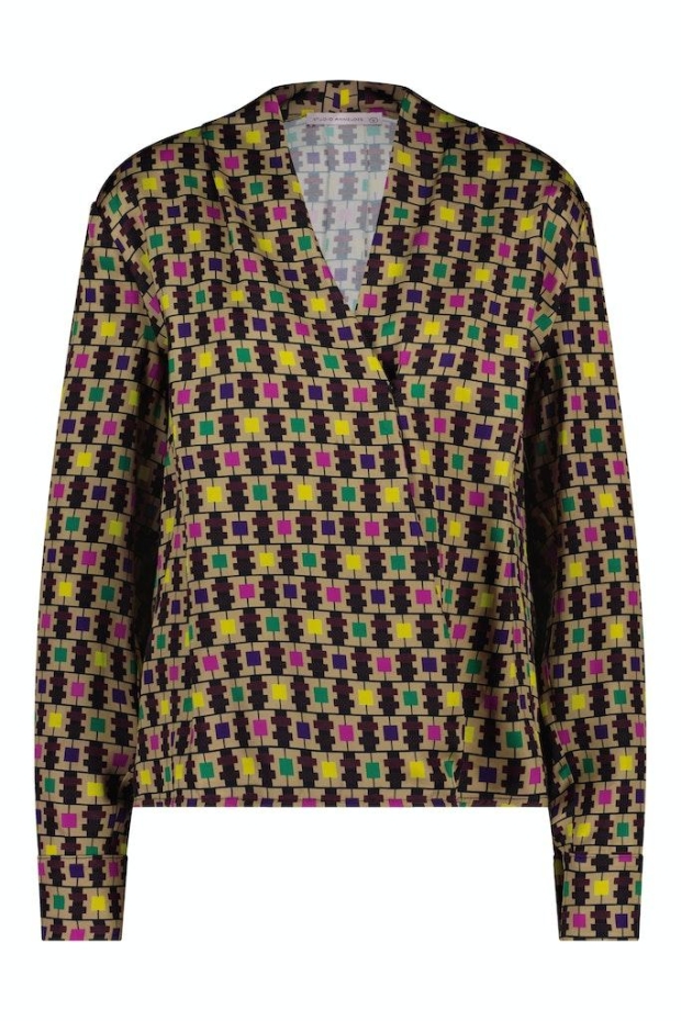 Studio Anneloes Grace graphic satin blouse 09080 8429 camel/lime
