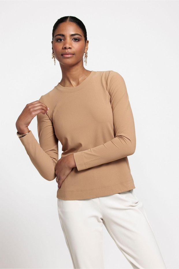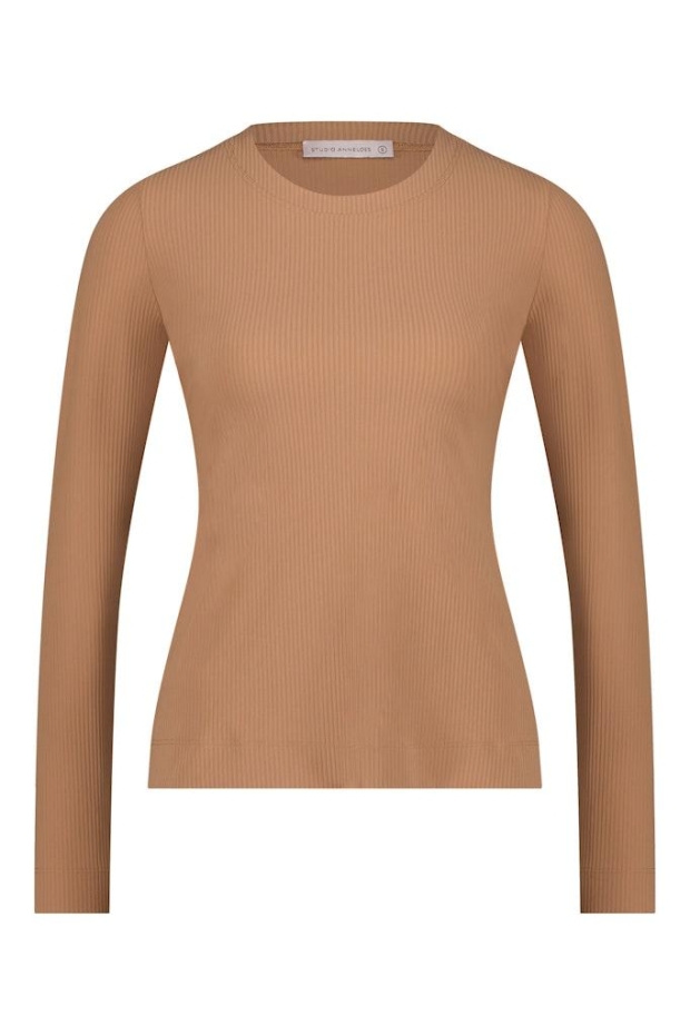 Ontdek de stijlvolle en comfortabele Travel rib LS Tee van STUDIO ANNELOES, perfect voor de modebewuste vrouw. Deze prachtige top in de kleur camel is een must-have voor je garderobe dit seizoen. Met zijn lange mouwen en tijdloze design combineert het moeiteloos stijl met comfort.