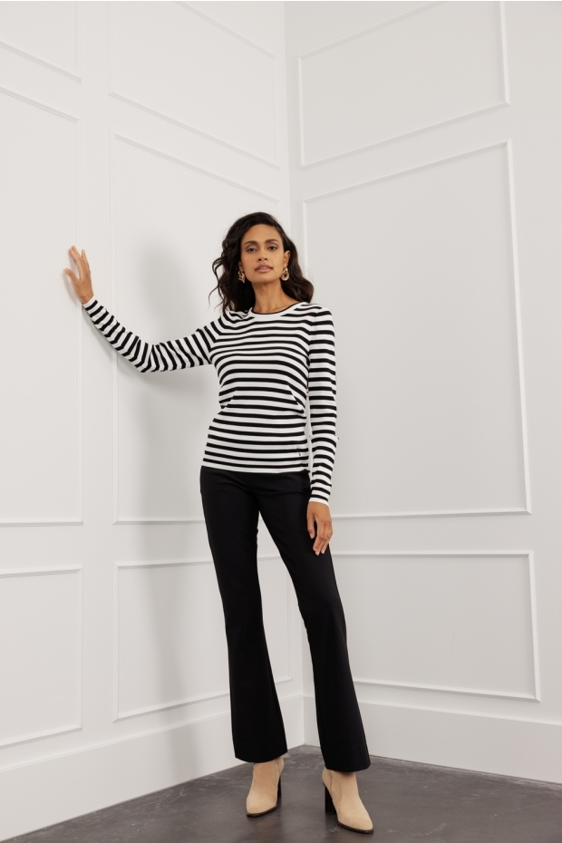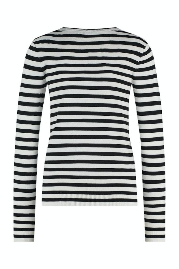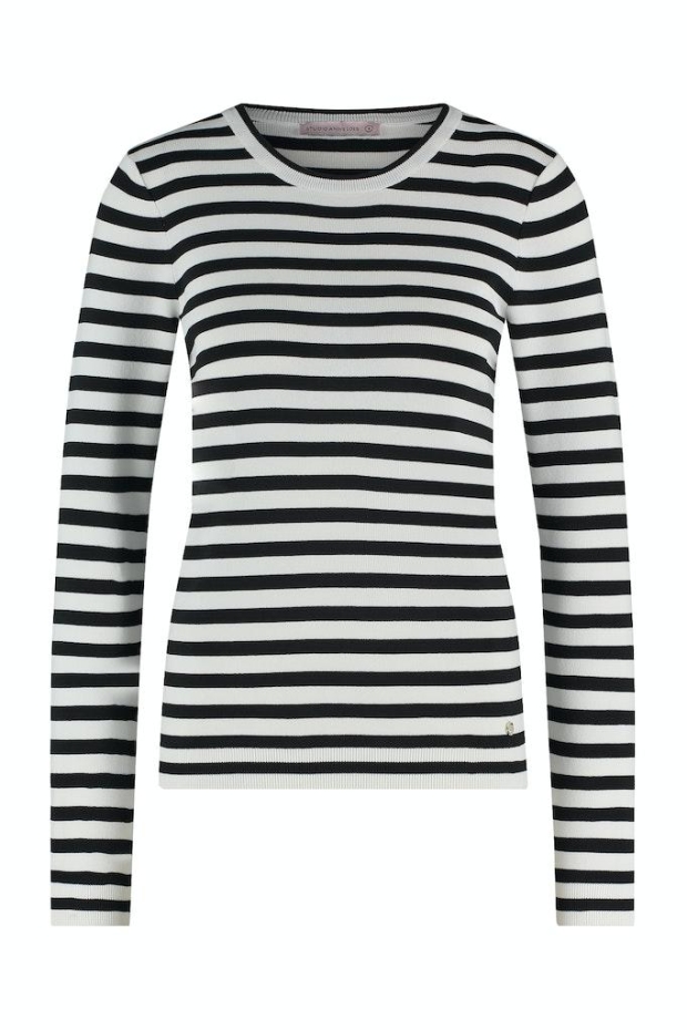 Ontdek de tijdloze elegantie en het comfort van de Luna stripe pullover van STUDIO ANNELOES. Deze stijlvolle trui, uitgevoerd in een klassieke off white kleur met zwarte strepen, is een must-have voor elke garderobe. Perfect voor zowel een casual dagje uit als een chique avondlook.