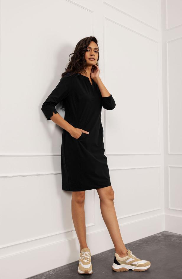 Ontdek de elegantie en het comfort van de Simplicity dress van STUDIO ANNELOES. Deze stijlvolle zwarte jurk is een tijdloze toevoeging aan je garderobe, perfect voor elke gelegenheid.