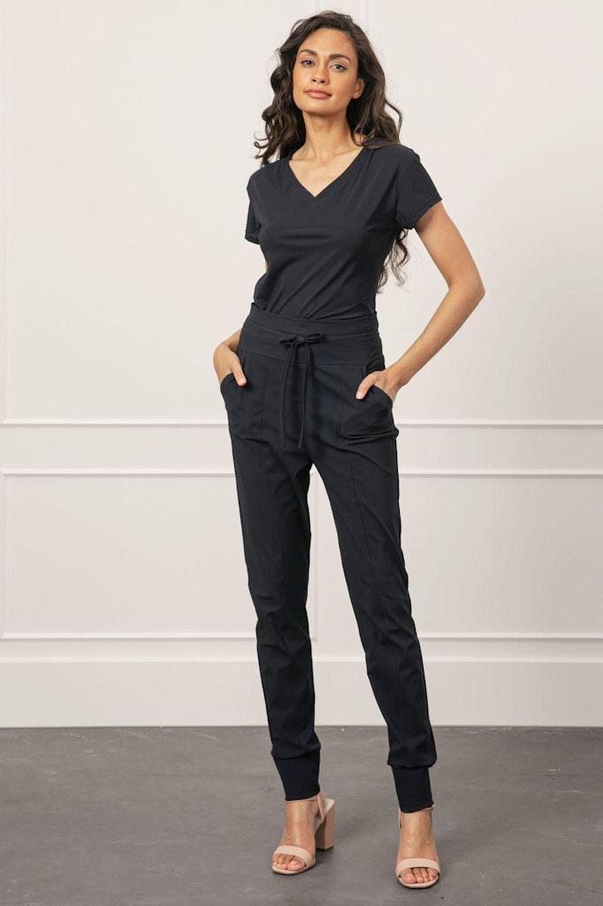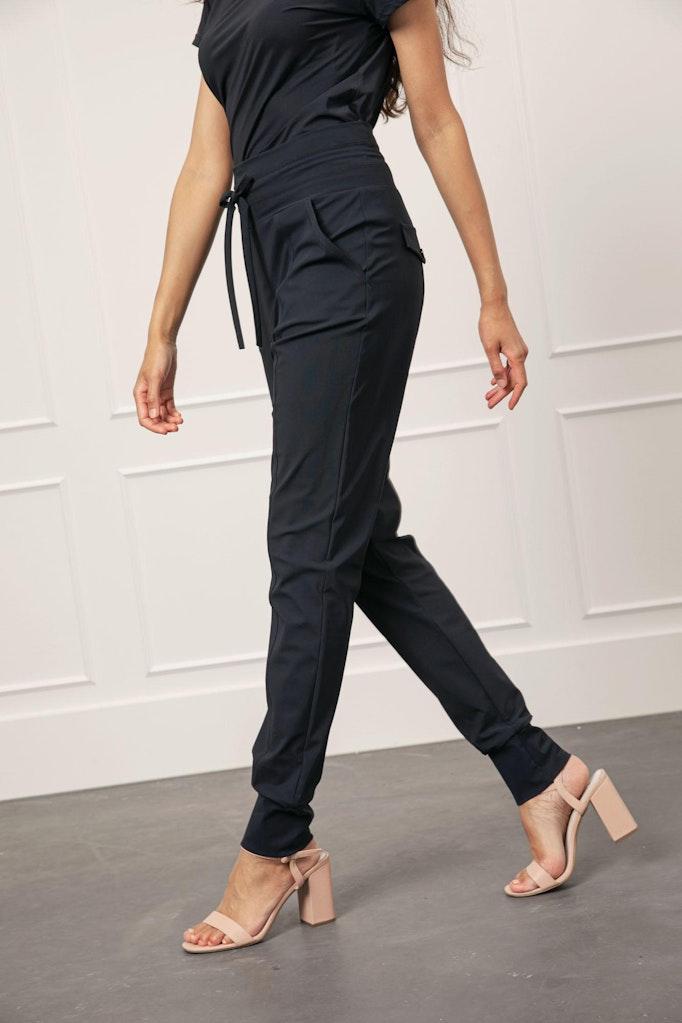 - Uitgevoerd in een stijlvolle donkerblauwe kleur, waardoor deze broek moeiteloos te combineren is met diverse outfits.