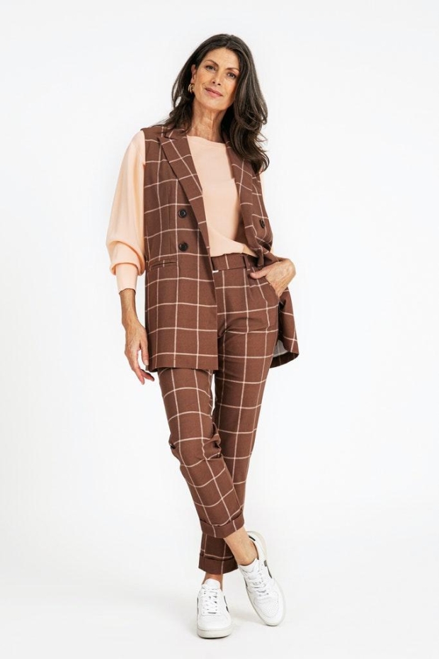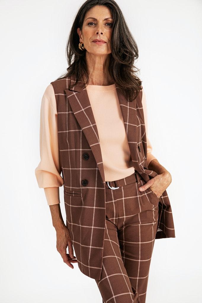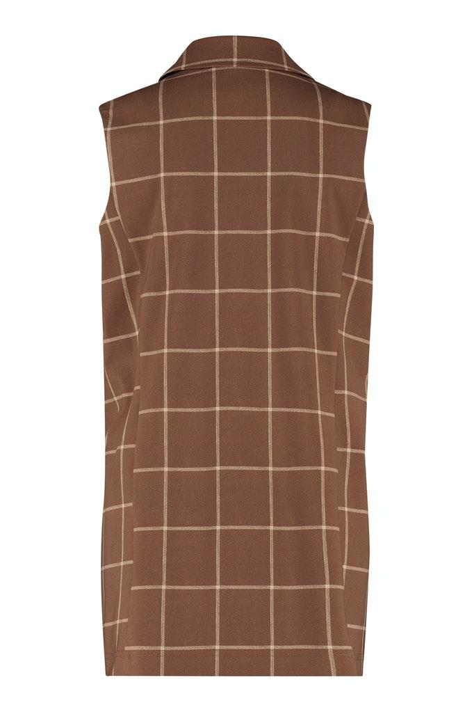 - Uitgevoerd in een tijdloze bruin met mocha/offwhite ruit, makkelijk te combineren met diverse outfits.