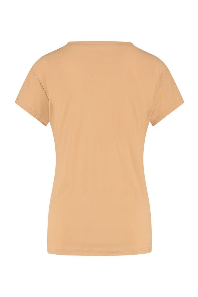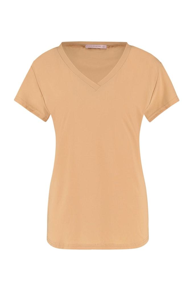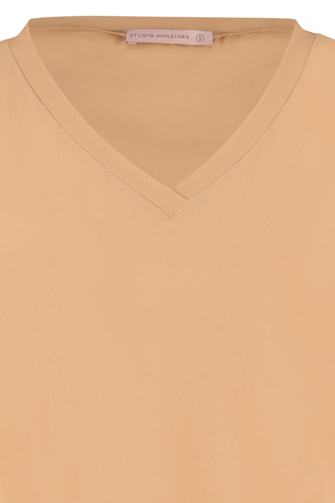 Maak kennis met het Roller shirt van STUDIO ANNELOES, een stijlvolle toevoeging aan je zomergarderobe. Uitgevoerd in een prachtige zandkleur, belichaamt dit T-shirt met korte mouwen en V-hals de perfecte combinatie van comfort en stijl voor de moderne vrouw.