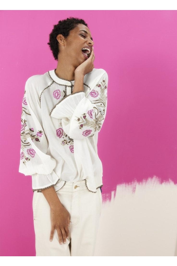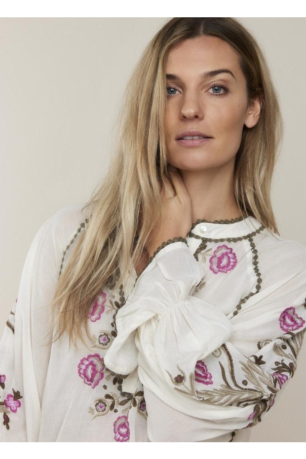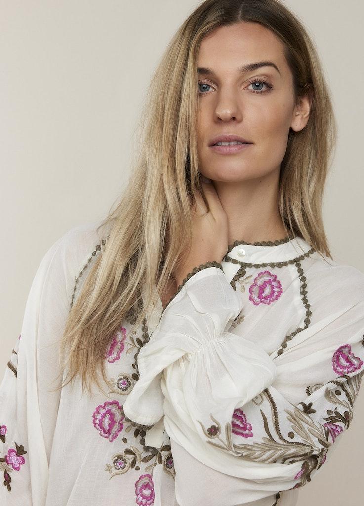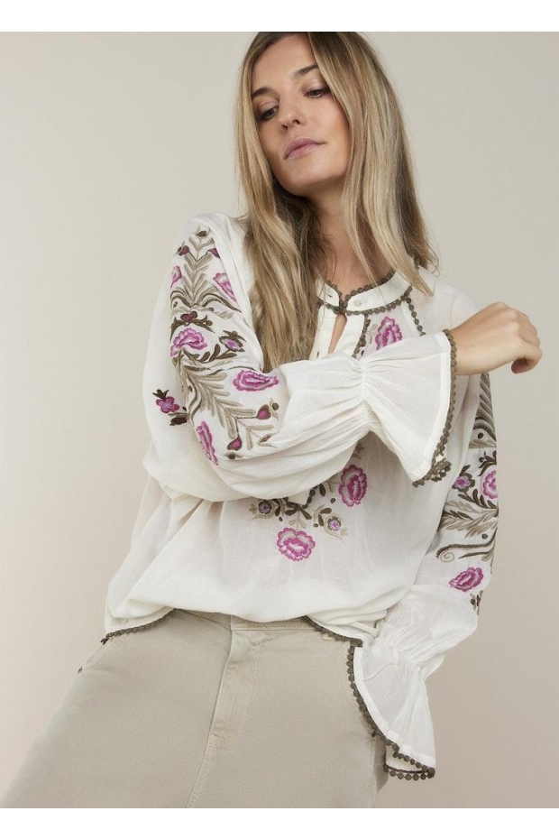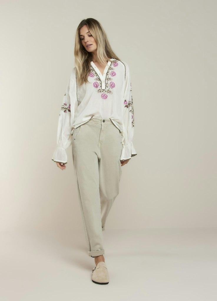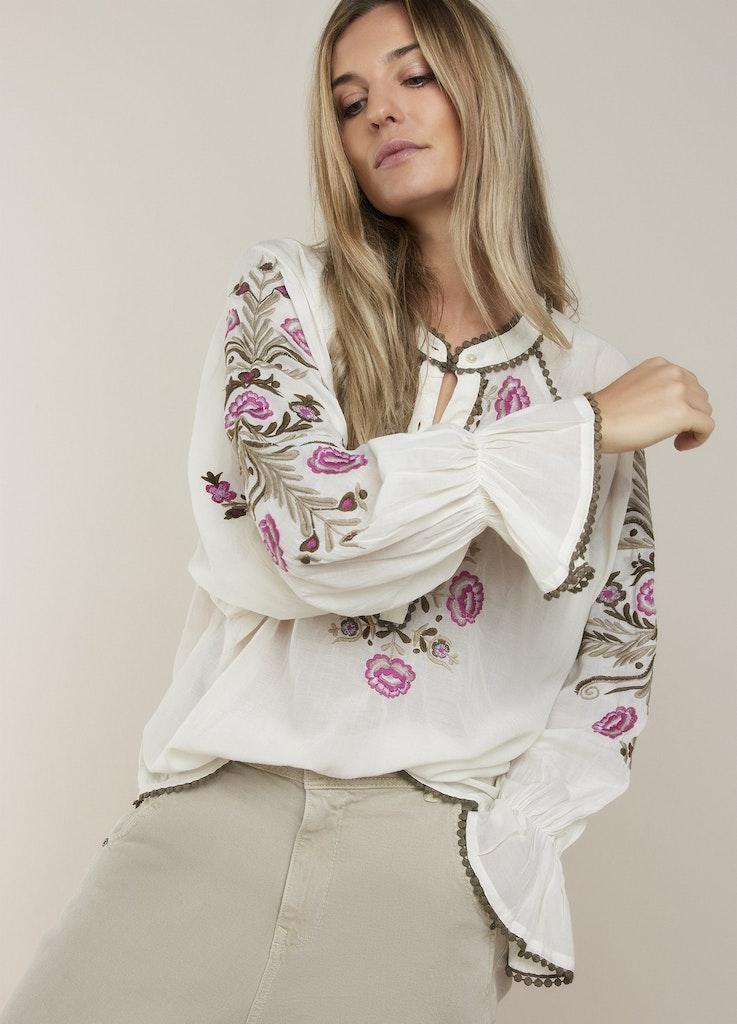 Ontdek de perfecte aanvulling op jouw garderobe met de stijlvolle Top Flower Embroidery van SUMMUM. Deze prachtige top in de kleur Off White is een must-have voor elke modebewuste vrouw. Met zijn lange mouwen en unieke bloemenborduursel is deze top niet alleen ideaal voor elk seizoen, maar ook een statement stuk dat veelzijdigheid en elegantie uitstraalt.