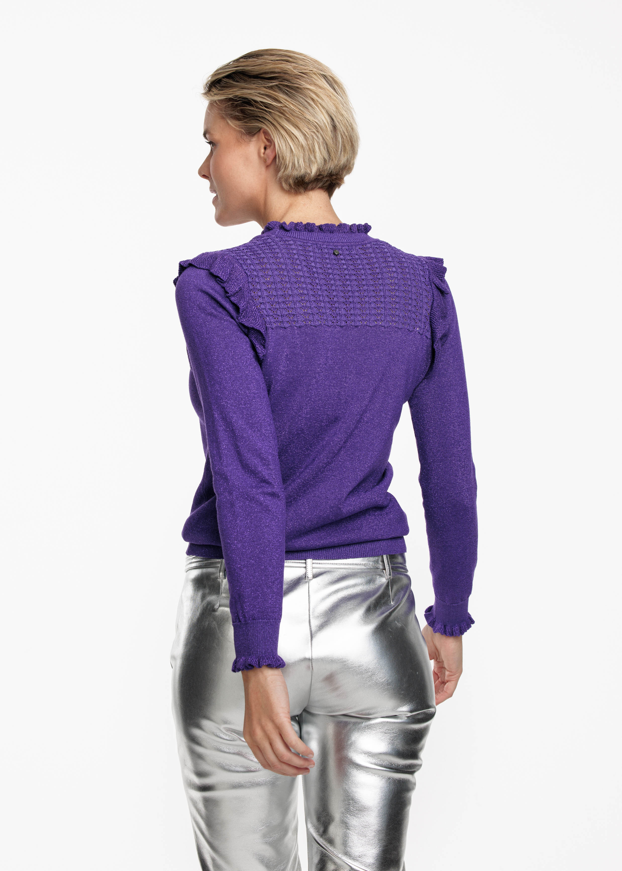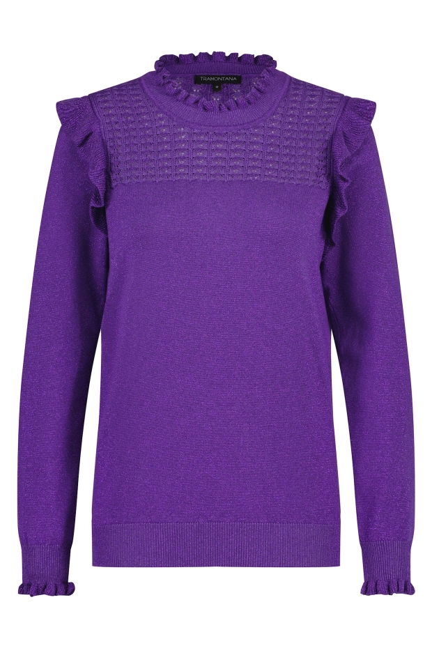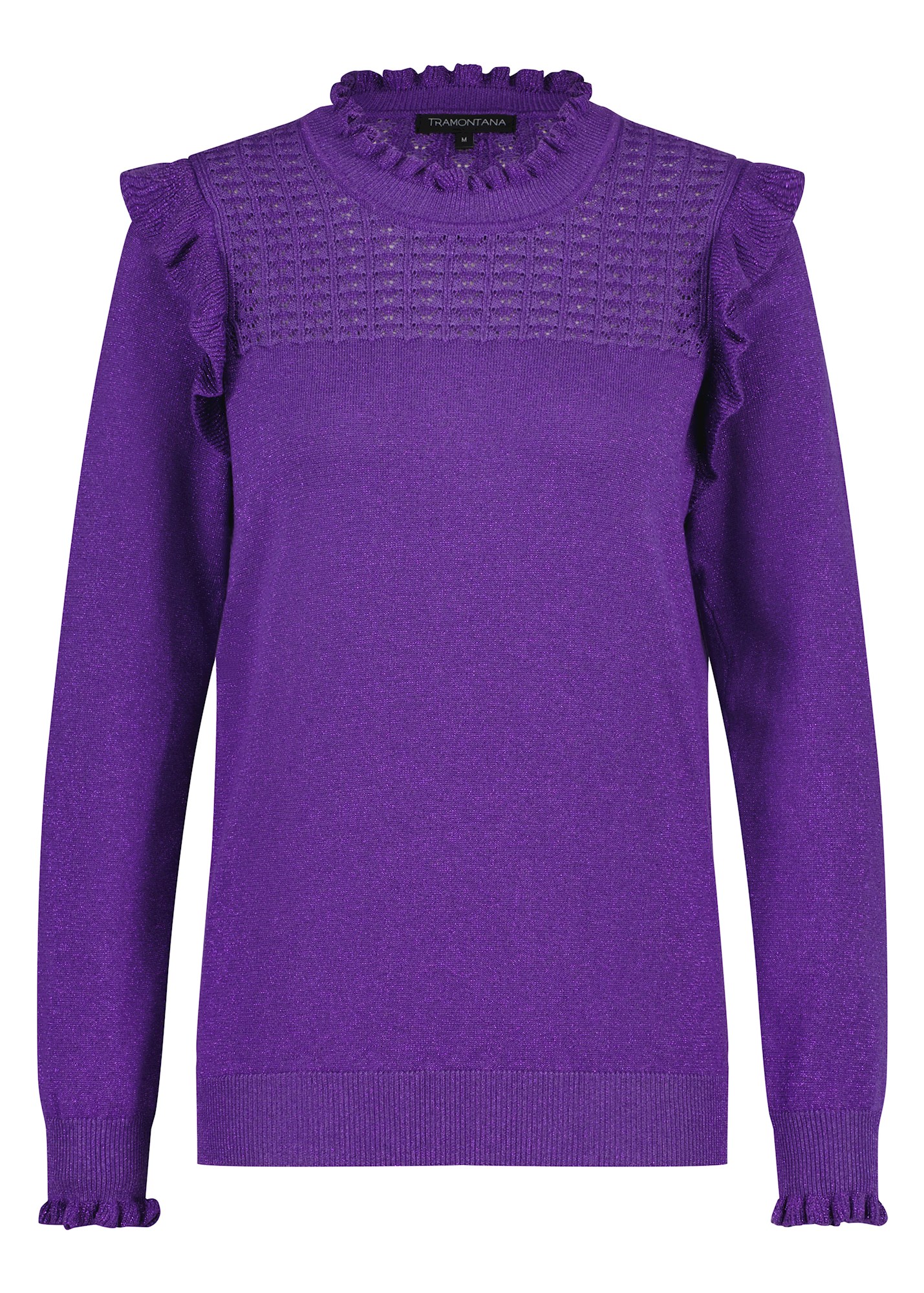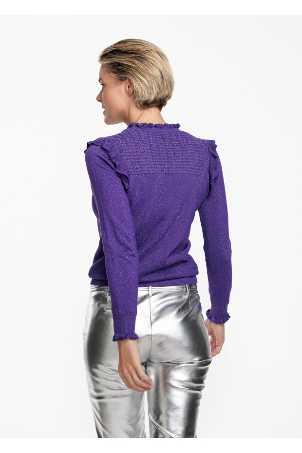 Gebreide jumper met ajours details langs de borst en schouders met ruffles langs de ronde hals, mouwinzet en de manchet. Gemaakt van een viscosemix met ton sur ton lurex.